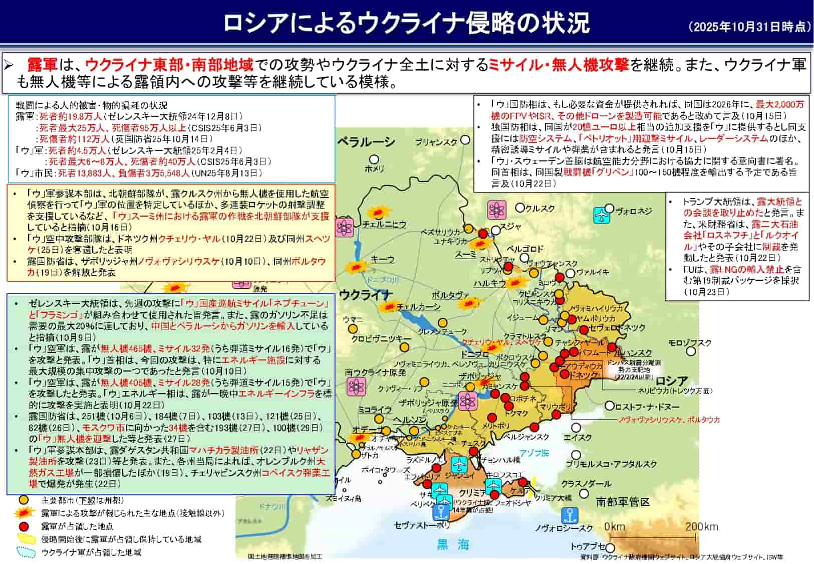 これまでの記事一覧 関連記事絞り込むすべて見るすべて陸の防衛海の防衛空の防衛日本の防衛その他ニュース解説用語集特集123…135次へ>>報道官が記者会見 秋田県での「熊の捕獲活動支援」の準備状況と見通し(11月4日)記者会見2025-11-7小泉防衛大臣が記者会見 F-35B訓練開始、熊被害対策での秋田県への自衛隊派遣など(11月4日)記者会見2025-11-7防衛省、カザフスタンで衛生分野の能力構築支援を実施へ 11月9日~15日まで海外派遣防衛交流陸の防衛2025-11-7小泉防衛大臣、オーストラリアのマールズ国防大臣と会談(11月2日)要人の動き防衛交流2025-11-7小泉防衛大臣、ラオスのカムリエン国防大臣と会談 人道支援・災害救援で連携強化(11月2日)要人の動き防衛交流2025-11-7小泉防衛大臣、ニュージーランドのコリンズ国防大臣と会談 太平洋島嶼国との連携強化で一致(12月2日)要人の動き防衛交流2025-11-7日米豪比4か国防衛相が共同発表 南シナ海の現状変更に強く反対(11月1日)要人の動き防衛交流2025-11-7小泉防衛大臣、アメリカのヘグセス戦争長官と会談 同盟深化と戦略環境対応を確認、日米韓の連携も強調(11月1日)要人の動き防衛交流2025-11-7小泉防衛大臣が韓国のアン国防部長官と会談 北朝鮮情勢に深刻な懸念共有(11月1日)要人の動き防衛交流2025-11-7人事発令 11月1日付・4日付、1佐職人事(陸自1名、海自3名、空自2名)人事2025-11-7小泉防衛大臣がマレーシアで臨時記者会見 防衛装備移転の拡大に意欲、中国の軍拡に現実的対応を強調(11月2日)記者会見2025-11-7中国海軍艦艇1隻が、大隅海峡を西進、東シナ海へ向け航行(10月31日、ルーヤンⅢ級)周辺国の動向海の防衛2025-11-6小泉防衛大臣がインドネシア国防大臣と会談(11月1日)防衛交流要人の動き2025-11-6小泉防衛大臣がシンガポール国防大臣と会談(11月1日)防衛交流要人の動き2025-11-6小泉防衛大臣が中国国防部長と会談(11月1日)防衛交流要人の動き2025-11-6小泉防衛大臣が第9回日ASEAN防衛担当大臣会合に出席(11月1日)防衛交流要人の動き2025-11-6小泉防衛大臣が「第12回拡大ASEAN国防相会議」に出席(11月1日)防衛交流要人の動き2025-11-6小泉防衛大臣がマレーシアで臨時記者会見 ADMMプラス、各国防衛相会談などについて言及(11月1日)記者会見2025-11-6日本が国連総会に提出していた核兵器廃絶決議案が145か国の支持を得て採択(11月1日)国際情勢2025-11-6ニュージーランド空軍のP-8Aが11月上旬~下旬、北朝鮮籍船舶の「瀬取り」警戒監視活動を実施予定(10月31日)周辺国の動向国際情勢2025-11-6米軍再編に係る三沢飛行場から小松基地への訓練移転を11月10~19日に実施予定(10月31日)訓練・演習防衛交流空の防衛在日米軍2025-11-6令和7年度日米豪共同離島等統合防災訓練を11月15日に実施予定訓練・演習防衛交流在日米軍2025-11-5日米合同委員会合意の発表 FAC4161小松飛行場の追加財産の限定使用に合意(10月31日)在日米軍2025-11-5日米合同委員会合意の発表 FAC3194航空装備研究所新島支所の財産の限定使用に合意(10月31日)在日米軍2025-11-5ロシア軍によるウクライナ侵略の状況 10月31日 防衛省まとめ国際情勢2025-11-5123…135次へ>>