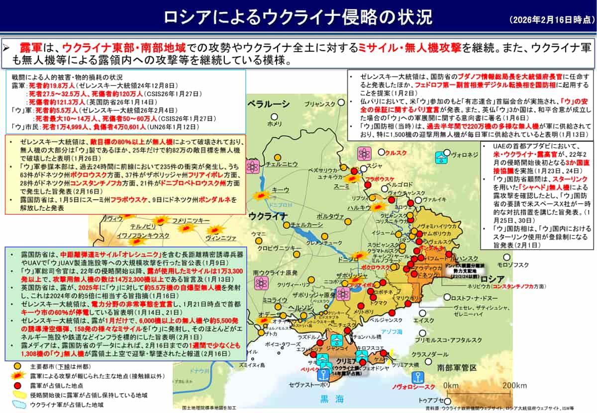 国際情勢の防衛ニュース 関連記事国連などによる世界的な安全保障への取り組み、日本の機関が伝える他国の安全に関するニュースをお届けします。関連カテゴリすべて見るすべて在日米軍国際情勢企業123…10次へ>>ロシア軍によるウクライナ侵略の状況 2月16日 防衛省まとめ国際情勢2026-2-27吉野審議官、ウクライナ支援に関する多国間会議にオンライン参加(2月13日)国際情勢防衛交流2026-2-17国連軍合同会議を開催、国連軍地位協定について協議(1月29日)要人の動き在日米軍国際情勢2026-2-2茂木外相がイスラエルの軍民調整センターを視察 ガザ人道支援で連携確認(1月11日)要人の動き国際情勢2026-1-14G7外相電話会合に茂木外務大臣が出席、ベネズエラおよびウクライナ情勢について意見交換(1月7日)国際情勢政府発表2026-1-9米国によるベネズエラ大統領身柄拘束を受け、外務報道官が談話を発表(1月4日)政府発表国際情勢2026-1-5中国軍による台湾周辺での軍事演習について 中国に懸念伝える政府発表国際情勢2025-12-31ロシア軍によるウクライナ侵略の状況 12月25日 防衛省まとめ国際情勢2025-12-27外務省、韓国軍による竹島に関する軍事訓練に抗議(12月24日)周辺国の動向国際情勢2025-12-26ノースロップ・グラマンのIBCS統合戦闘指揮システム、ポーランドで完全運用能力を達成(12月18日)企業国際情勢その他2025-12-22中野審議官、ウクライナ支援に関する多国間会議ににオンライン参加(12月16日)国際情勢防衛交流2025-12-19連合宇宙作戦(CSpO)イニシアチブ将官級会議の概要を発表(12月12日)防衛交流国際情勢2025-12-16小泉防衛大臣とヘグセス米戦争長官が電話会談を実施(12月12日)要人の動き国際情勢2025-12-16アジア海賊対策地域協力協定(ReCAAP)情報共有センター(ISC)、能力構築エグゼクティブ・プログラムのオンライン研修を実施(12月10日)事業・計画防衛交流国際情勢2025-12-16カンボジア王国とタイ王国の国境情勢の悪化を憂慮 外務報道官の談話(12月8日)国際情勢2025-12-10日豪防衛相共同声明にて、戦略的防衛調整枠組み(FSDC)の設置を発表(12月7日)要人の動き防衛交流国際情勢2025-12-10外務省、ウクライナへの無償資金協力に関する書簡の署名・交換を発表(12月3日)政府発表国際情勢2025-12-5ニュージーランドとの第16回防衛当局間(MM)協議の開催結果を公表(12月2日)防衛交流国際情勢2025-12-4高市総理大臣がG20南アフリカサミットに出席、首脳宣言を採択(11月22日)要人の動き政府発表国際情勢2025-11-27フランス海軍フリゲート「プレリアル」が北朝鮮籍船舶の「瀬取り」に対する警戒監視活動を実施(10月下旬)周辺国の動向海の防衛国際情勢2025-11-27ロシア軍によるウクライナ侵略の状況 11月19日 防衛省まとめ国際情勢2025-11-27高市総理がウクライナの和平に関する関係国首脳会合に参加(11月22日)要人の動き政府発表国際情勢2025-11-26北朝鮮籍船舶の違法な海上活動に対しニュージーランドが警戒監視活動を実施(11月上旬〜中旬)海の防衛国際情勢周辺国の動向2025-11-21NATO加盟国国会議員会議(NATO PA)代表団が防衛省を訪問(11月18日)防衛交流国際情勢2025-11-21米国が発表したガザ情勢に関する国連安全保障理事会決議が賛成多数で採択(現地時間11月17日)国際情勢2025-11-21123…10次へ>>