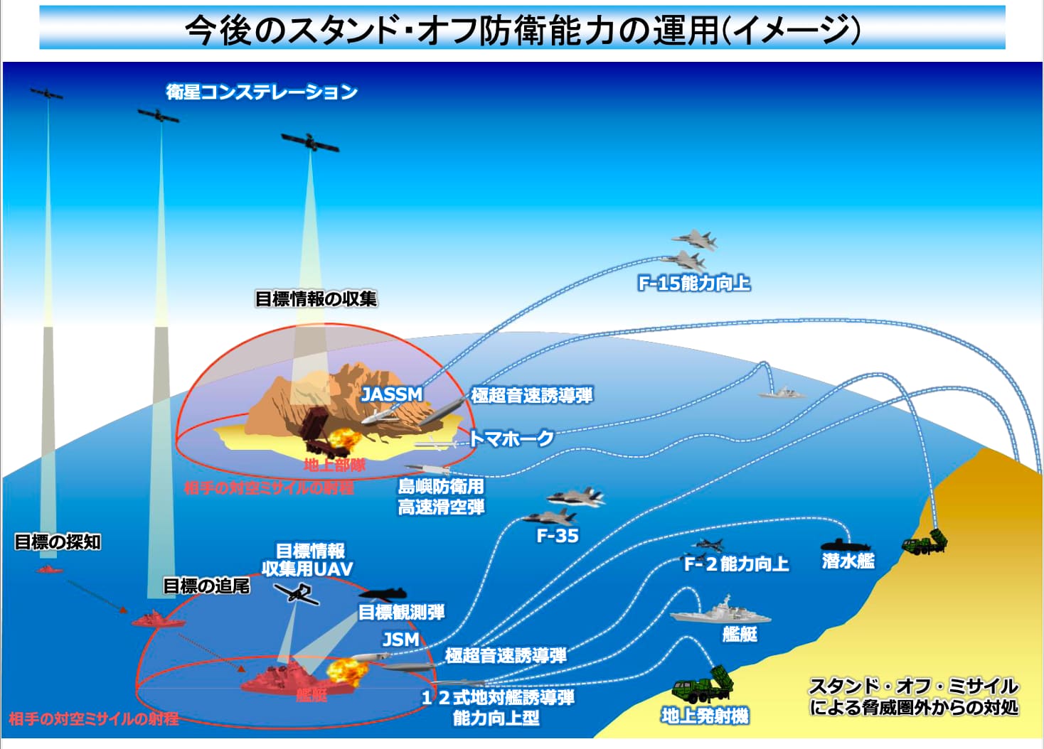 敵の防空システムなどがカバーする範囲の外側、それも出来る限り遠方から攻撃する「スタンド・オフ防衛能力」については、陸上自衛隊の 12式地対艦誘導弾能力向上型(地発型) 、 島嶼防衛用高速滑空弾 、 極超音速誘導弾 、海上自衛隊の 12式地対艦誘導弾能力向上型(艦発型) 、航空自衛隊のF-2能力向上型に搭載する 12式地対艦誘導弾能力向上型(空発型) 、F-35Aに搭載する JSM (Joint Strike Missile)、F-15能力向上機に搭載する JASSM (JASSM: Joint Air-to-Surface Stand-Off Missile(F-15能力向上機に搭載)の調達費と、これらに加えてすでに本体は調達済みの トマホーク巡航ミサイル を装備するための既存装備の改良費など、9,733億円が計上されている。