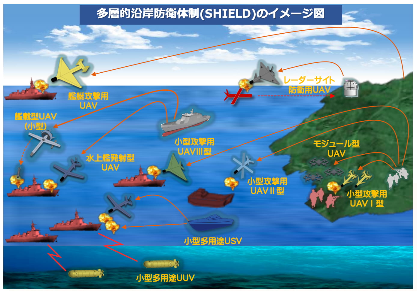 令和8年度予算案では「無人アセット防衛能力」の一環として、UAV(無人航空機)、USV(無人水上艇)、UUV(無人潜水艇)といった各種無人アセットを組み合わせた多層的沿岸防衛体制「SHIELD」(シールド、Synchronized,Hybrid ,Integrated and Enhanced Littoral Defense)を構築する方針が示されており、そのための経費として1,001億円が計上されている。