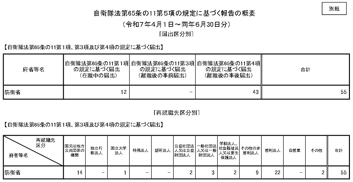自衛隊法(昭和29年法律第165号)第65条の11第5項の規定に基づき、令和7年4月1日から同年6月30日までの間に管理職隊員であった者の再就職状況の届出に係る事項について、別紙のとおり報告する。