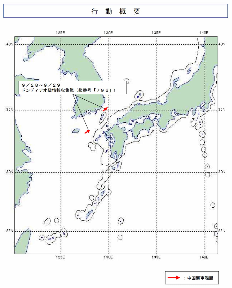 令和7年9月28日(日)午後11時頃、海上自衛隊は、対馬(長崎県)の南西約130kmの海域において、同海域を北東進する中国海軍ドンディアオ級情報収集艦(艦番号「796」)を確認した。