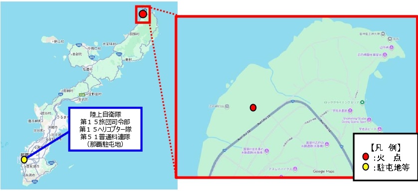 ○ 10月1日(水)、沖縄県国頭村において林野火災が発生。地元消防等による消火活動を実施するも鎮火に至らないことから、同日18時12分、沖縄県知事から陸上自衛隊第15旅団長(那覇・沖縄県)に対し、林野火災に伴う消火活動に係る災害派遣要請があり、同時刻受理。