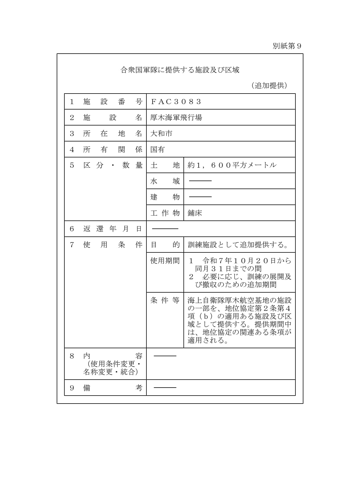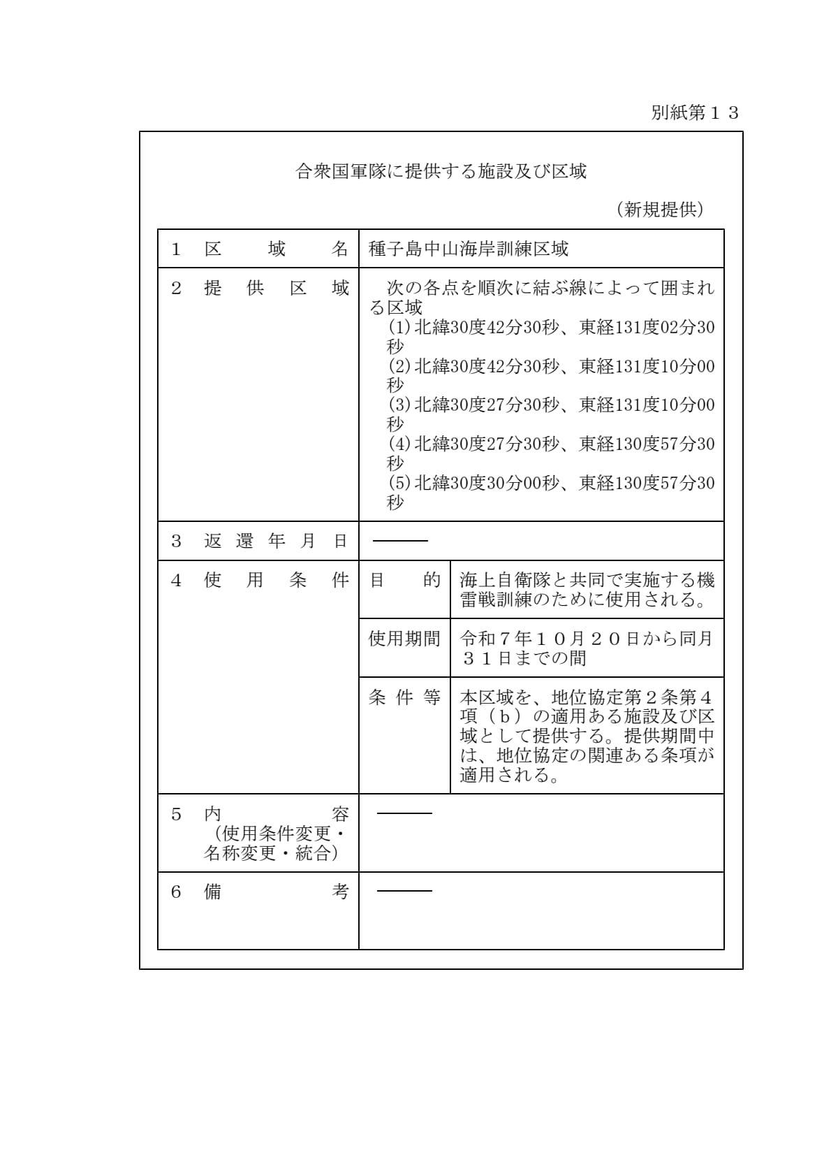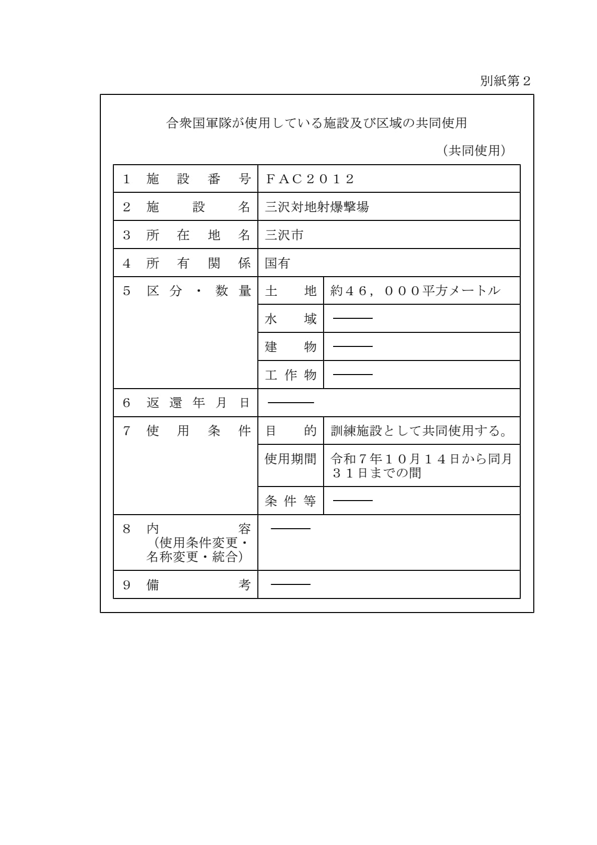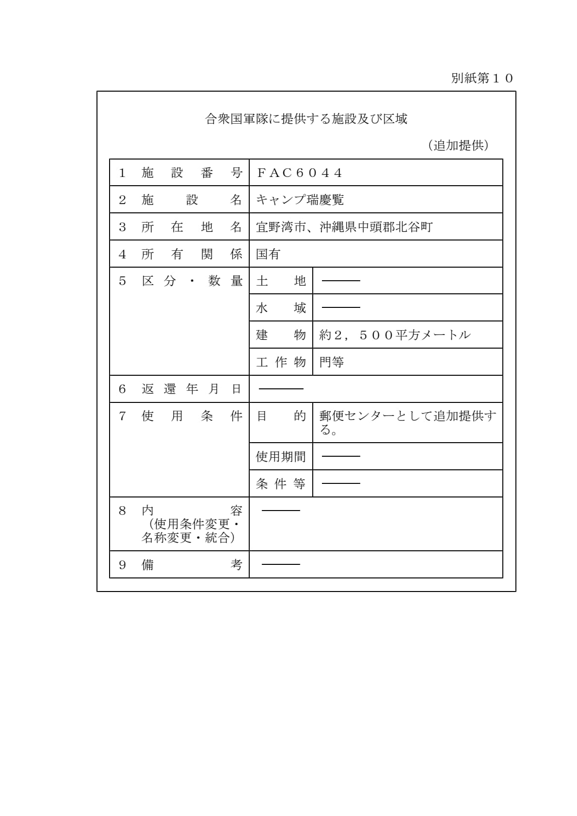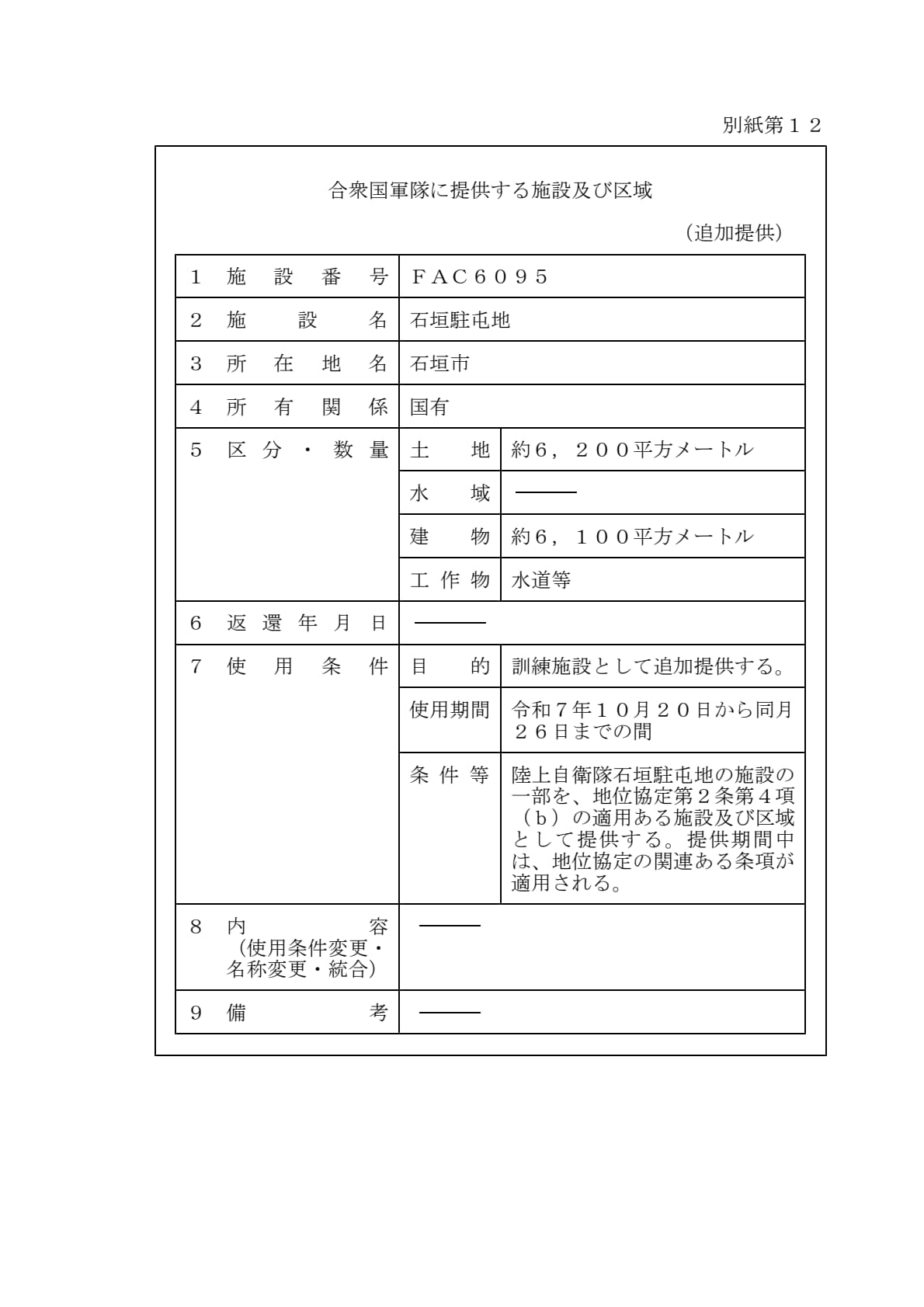 1960年1月19日ワシントンで署名された「日本国とアメリカ合衆国との間の相互協力及び安全保障条約第六条に基づく施設及び区域並びに日本国における合衆国軍隊の地位に関する協定」第2条に基づきアメリカ合衆国が使用を許される施設及び区域について、共同使用、追加提供及び新規提供を別添のとおり決定することとする。
