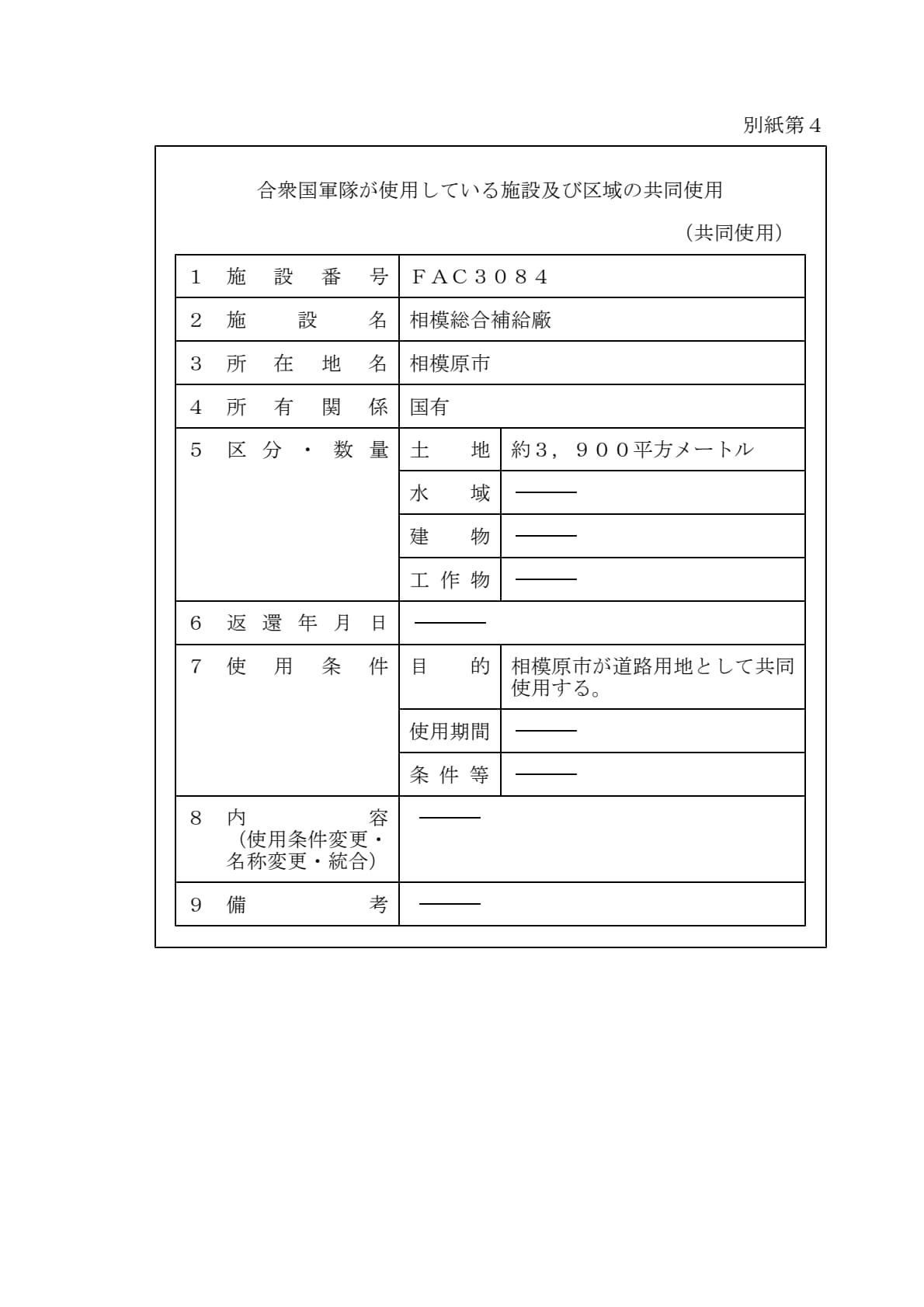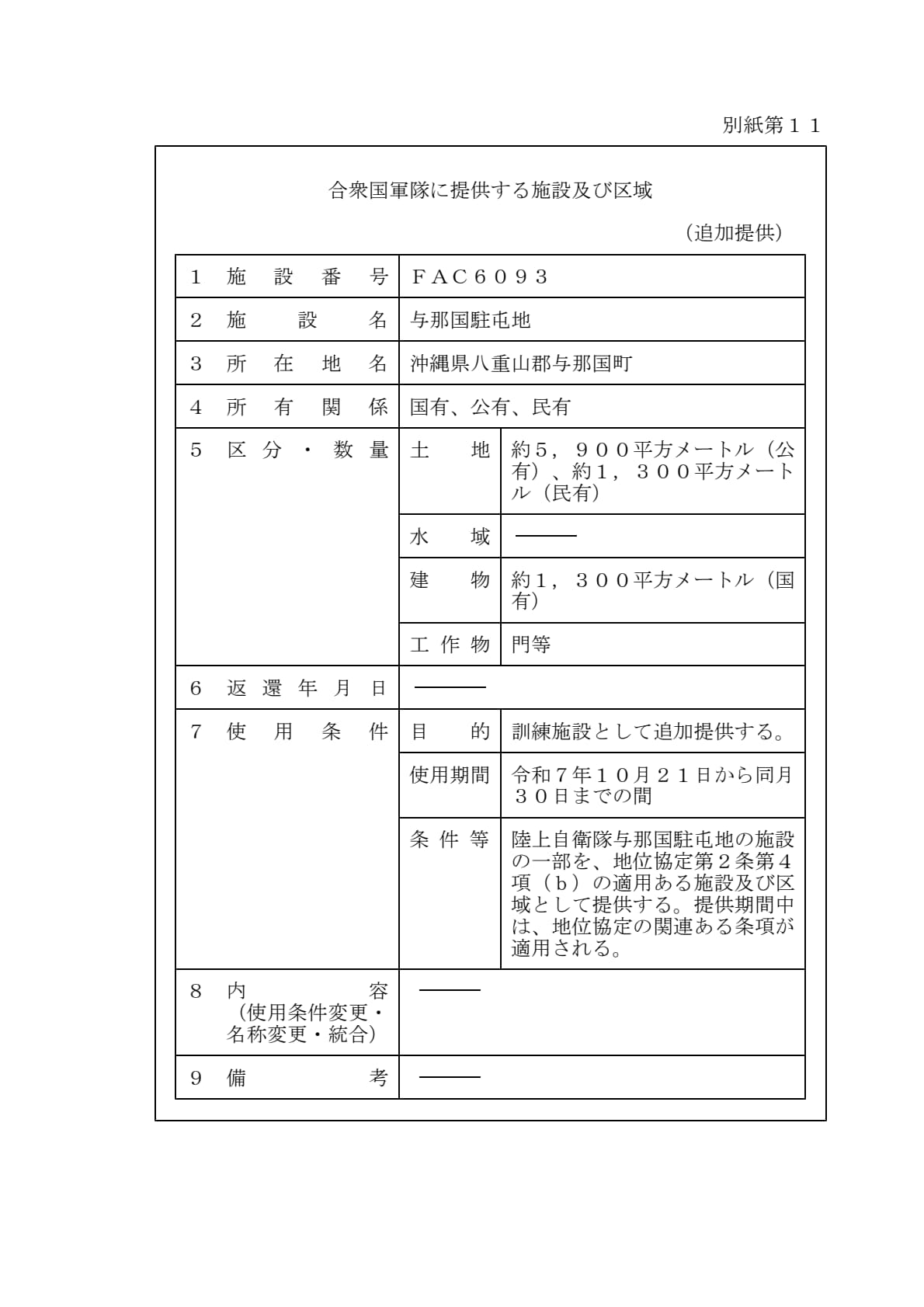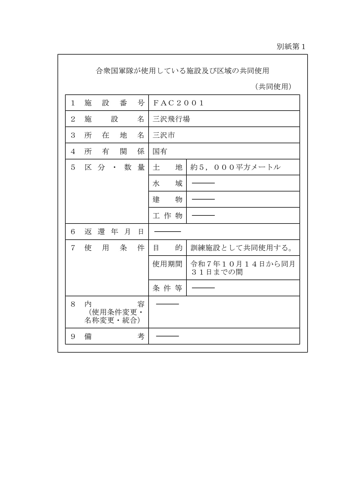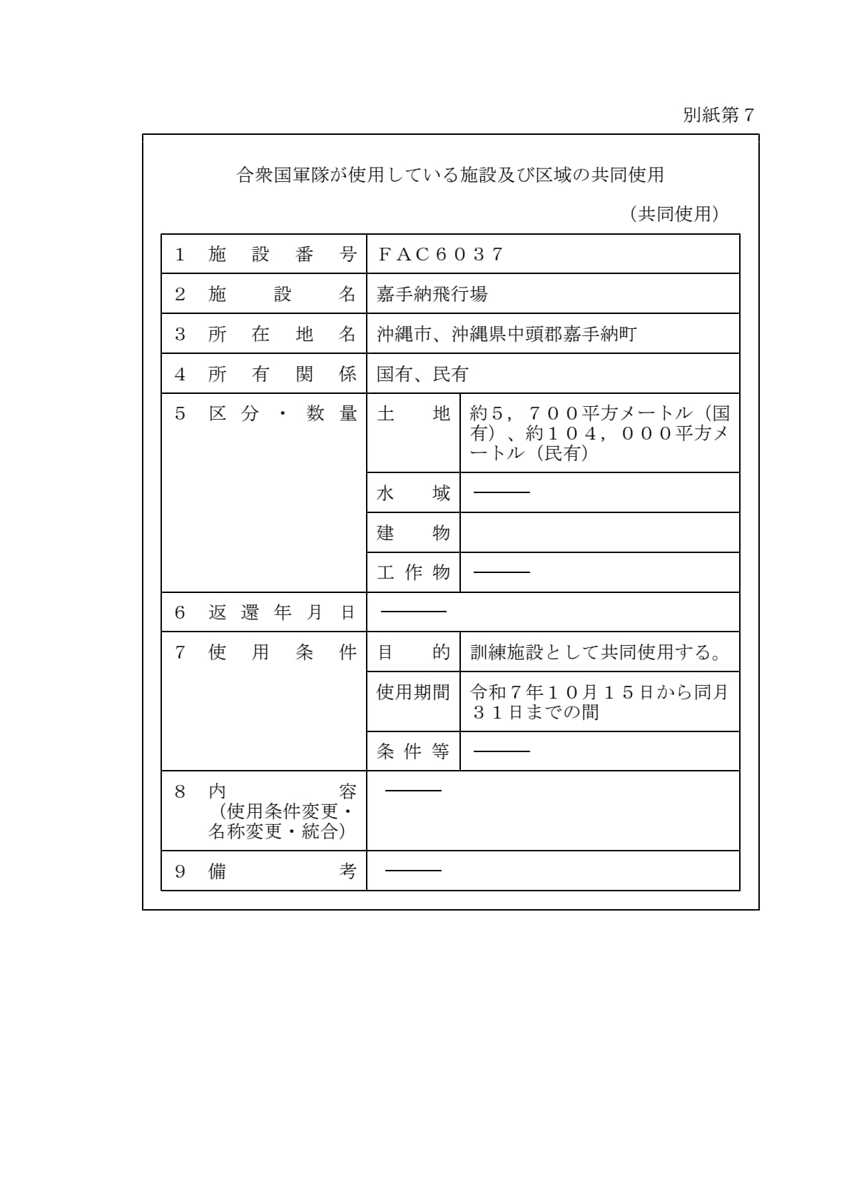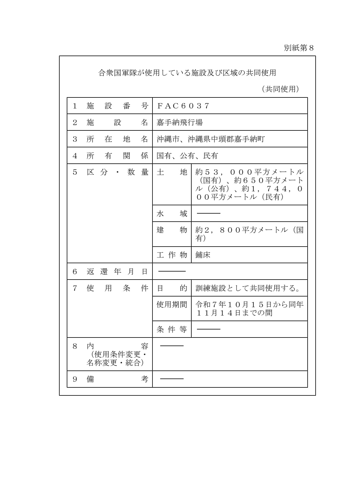 1960年1月19日ワシントンで署名された「日本国とアメリカ合衆国との間の相互協力及び安全保障条約第六条に基づく施設及び区域並びに日本国における合衆国軍隊の地位に関する協定」第2条に基づきアメリカ合衆国が使用を許される施設及び区域について、共同使用、追加提供及び新規提供を別添のとおり決定することとする。