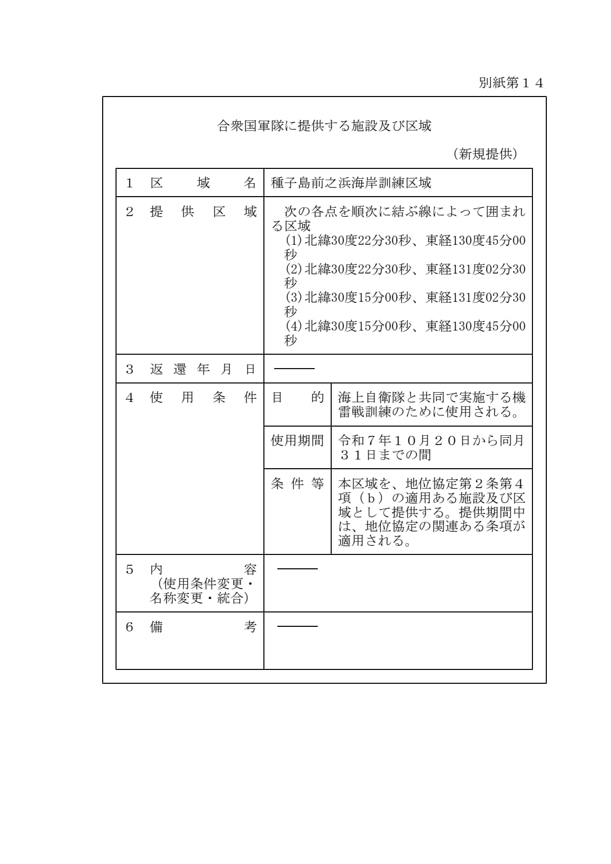 合同委員会における日本国政府の代表者及びアメリカ合衆国政府の代表者は、それぞれの政府のために合衆国軍隊が使用を許される施設及び区域について、共同使用、追加提供及び新規提供を別紙第1から別紙第14までのとおり合意した。