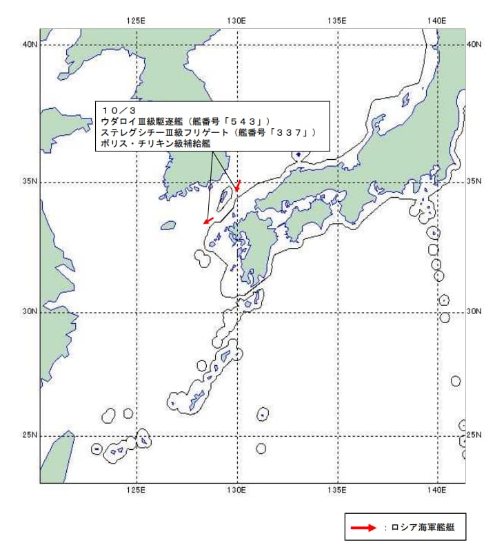 令和7年10月3日(金)午前2時頃、海上自衛隊は、対馬(長崎県)の北東約80kmの海域において、同海域を南西進するロシア海軍ウダロイⅢ級駆逐艦(艦番号「543」)、ステレグシチーⅢ級フリゲート(艦番号「337」)及びボリス・チリキン級補給艦の計3隻を確認した。