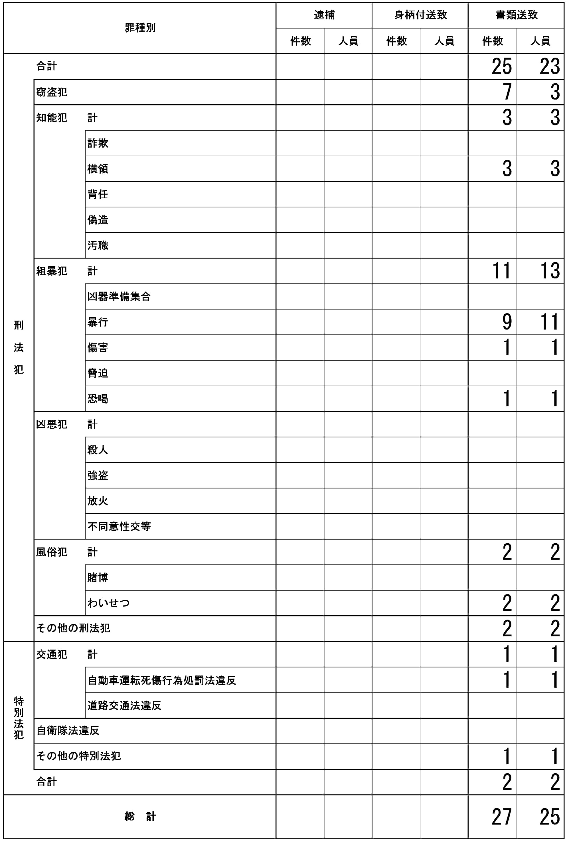 警務隊による逮捕・送致の実績(令和7年度8月分)