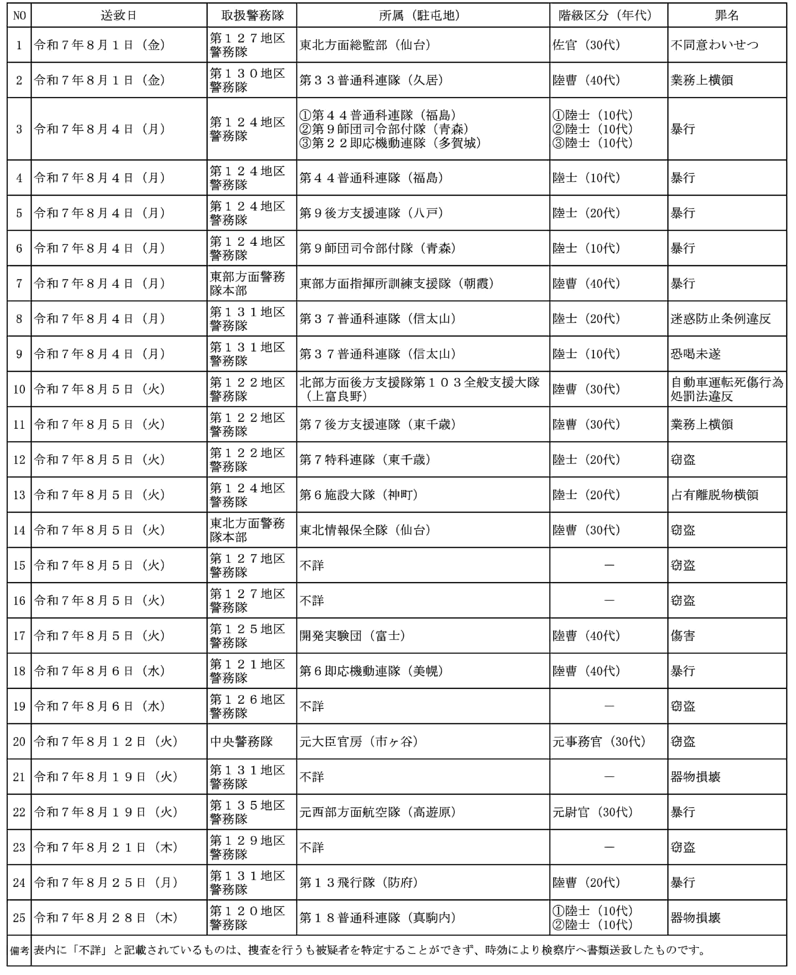 防衛省 陸上幕僚監部は令和7(2025)年10月10日(金)16時30分、令和7年8月の警務隊による逮捕・送致の実績について以下のように公表した。