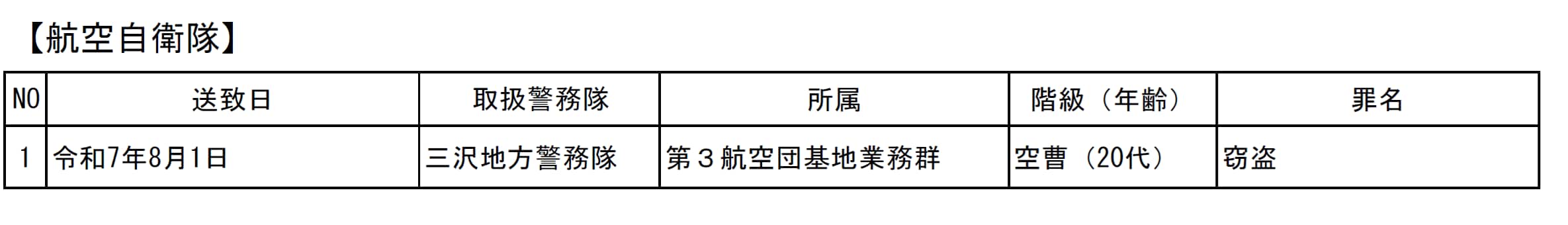 防衛省 航空幕僚監部は令和7(2025)年10月10日(金)16時30分、令和7年8月の警務隊による逮捕・送致の実績について以下のように公表した。