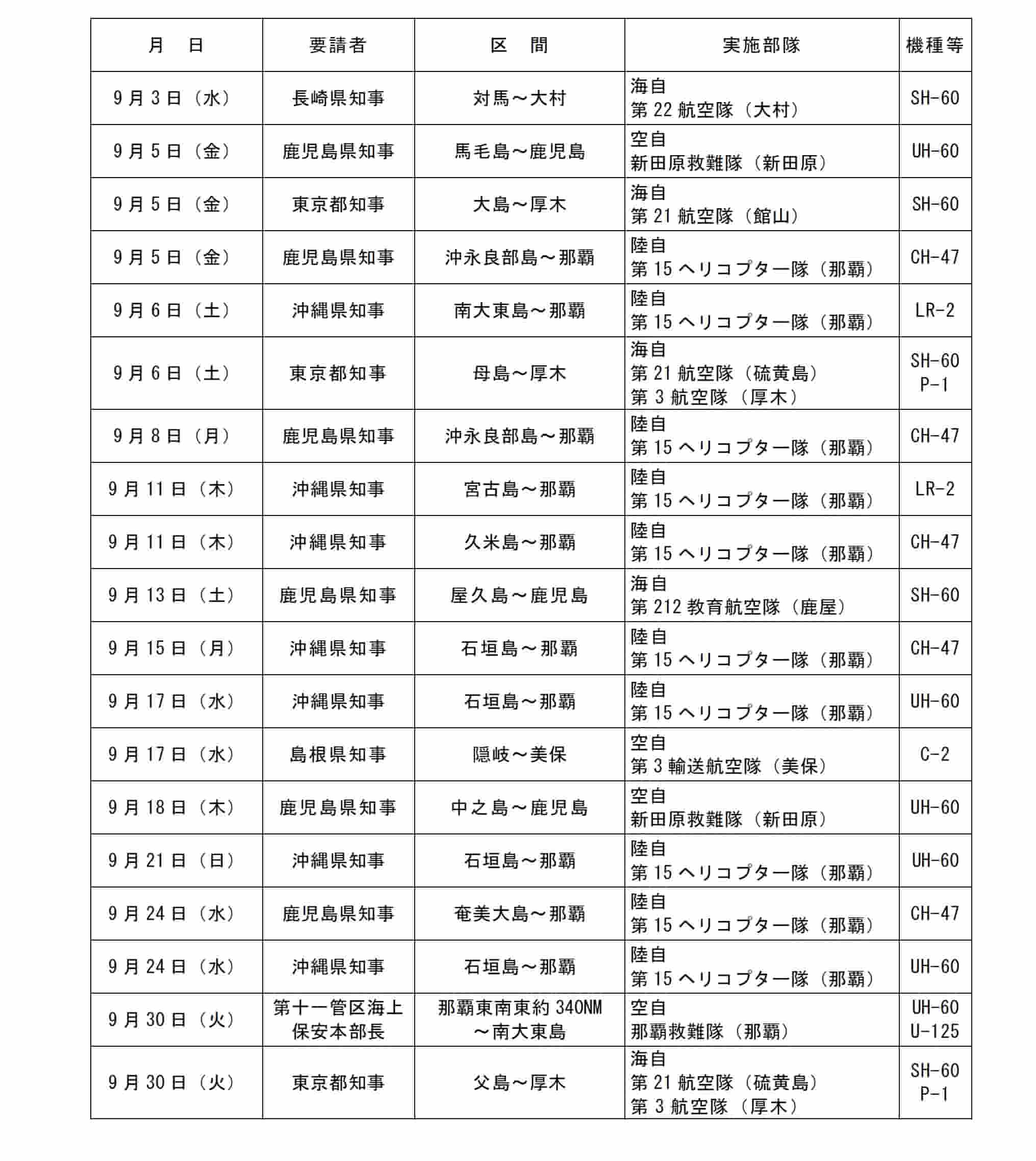 自衛隊の急患輸送実績 令和7年9月分を公表(10月10日)