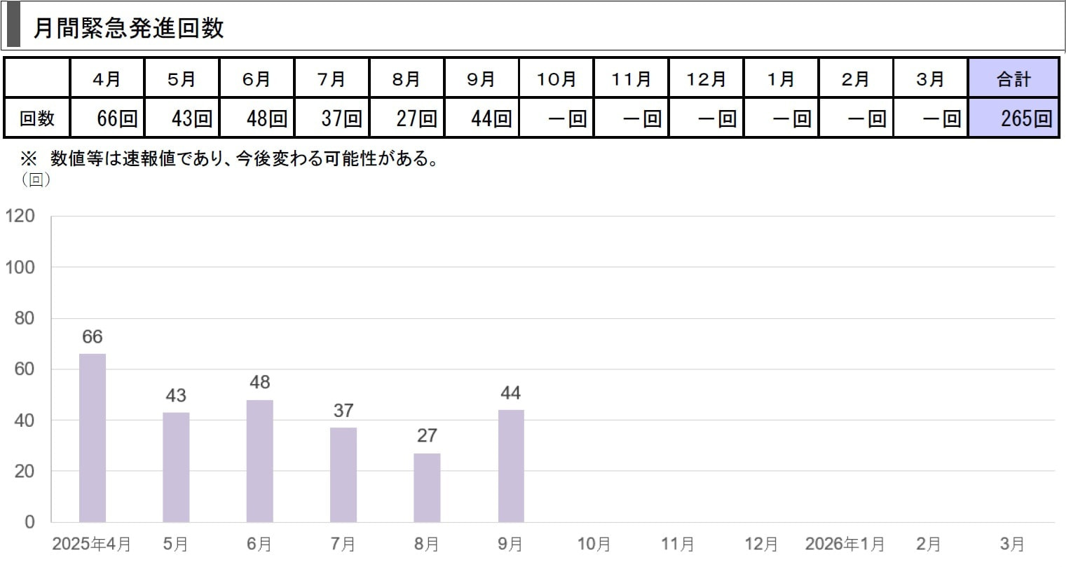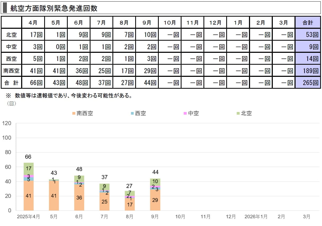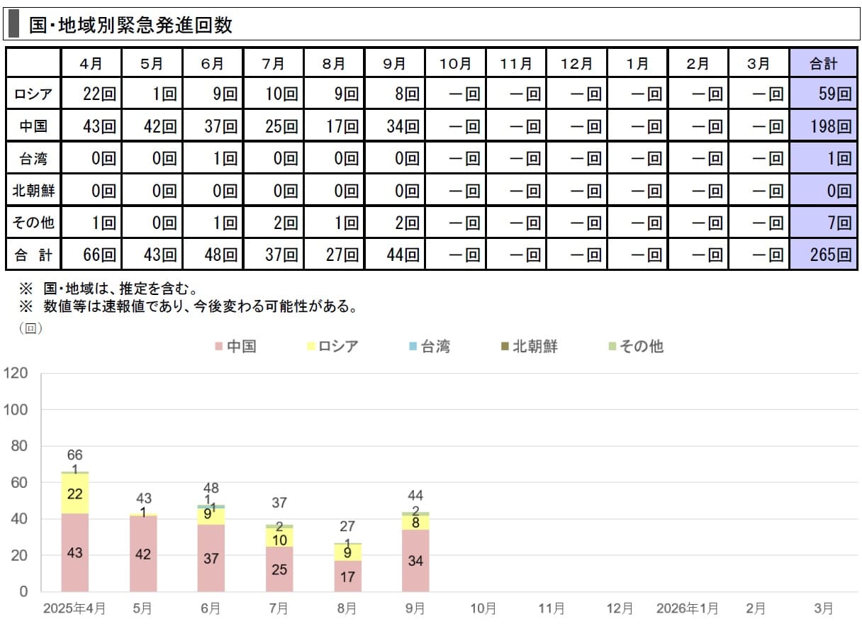 防衛省 統合幕僚監部は令和7(2025)年10月10日(金)、令和7(2025)年度における緊急発進実施状況として、同年9月30日現在の月間緊急発進状況を公表した。