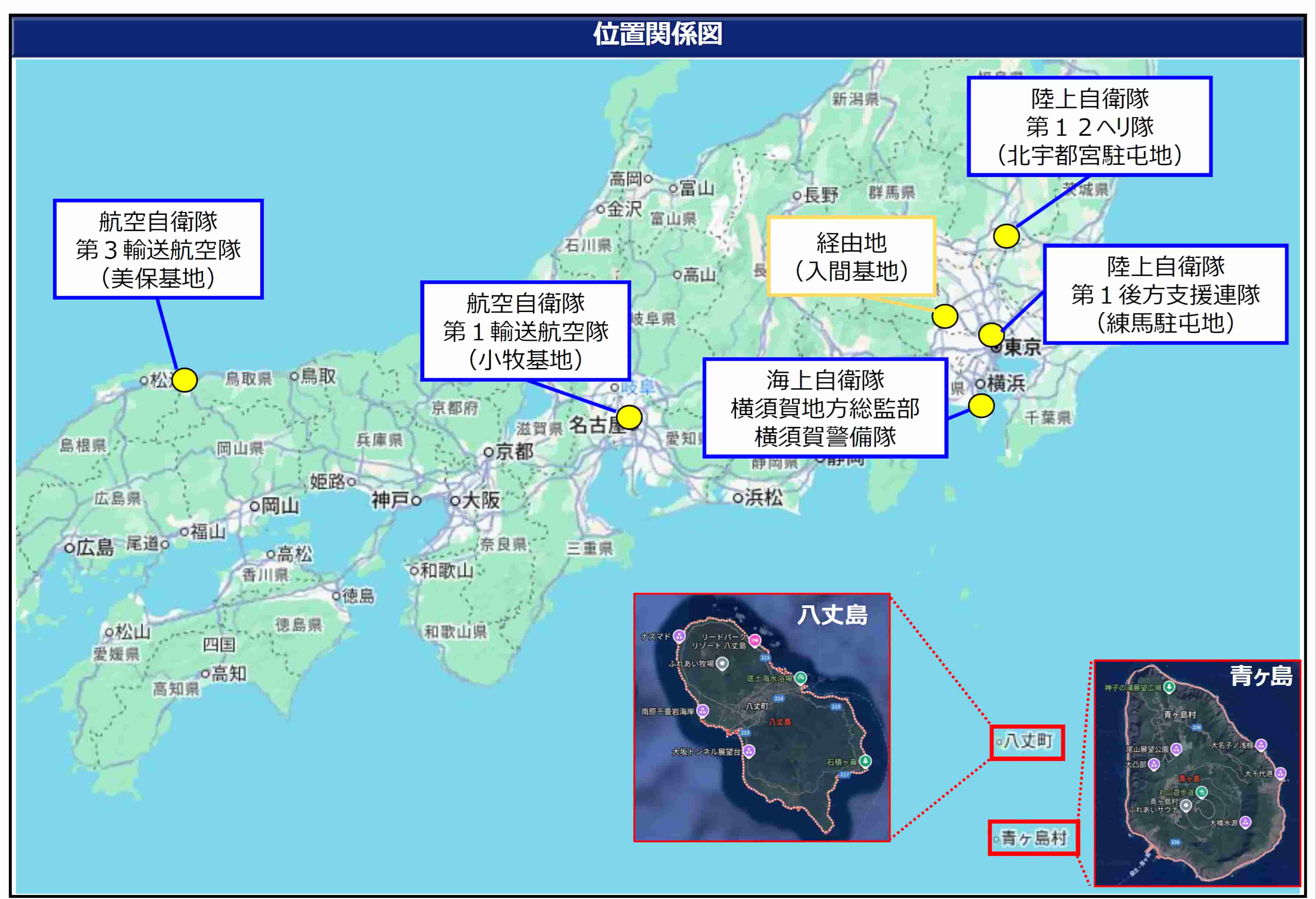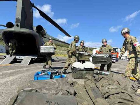 ・総務省からの依頼により10月10日(金)、航空自衛隊第1輸送航空隊(小牧・愛知)のC-130×1機及び陸上自衛隊第12ヘリコプター隊(北宇都宮・栃木)のUH-60×2機により通信事業者各社の作業員及び衛星通信機器等を青ヶ島村へ輸送。