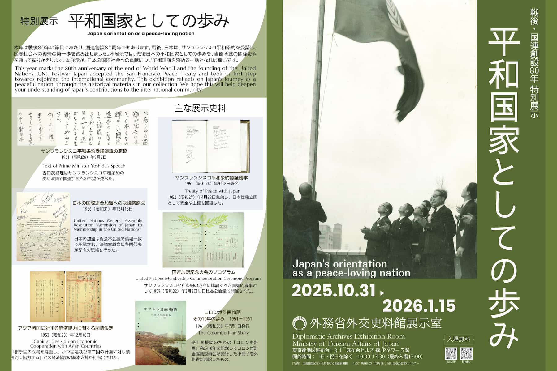 本年は戦後80年の節目にあたり、国連創設80周年でもあります。これを記念し、外務省外交史料館は、令和7年10月31日(金曜日)から令和8年1月15日(木曜日)まで、同展示室において、特別展示「平和国家としての歩み」を開催いたします。