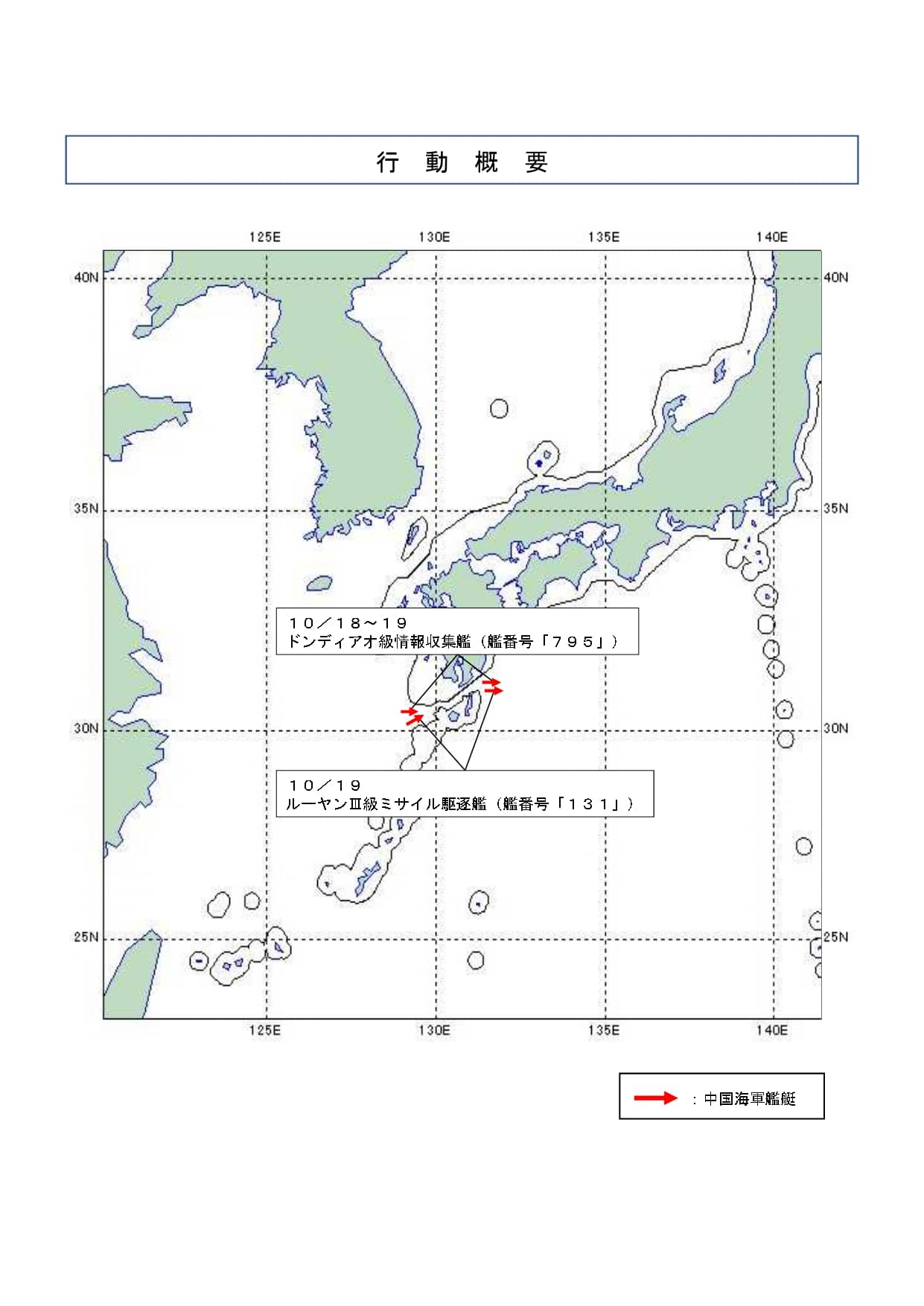 また、10月19日(日)午前1時頃、海上自衛隊は、口永良部島(鹿児島県)の西約40kmの海域において、同海域を北東進する中国海軍ルーヤンⅢ級ミサイル駆逐艦(艦番号「131」)を確認した。