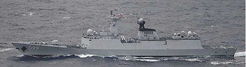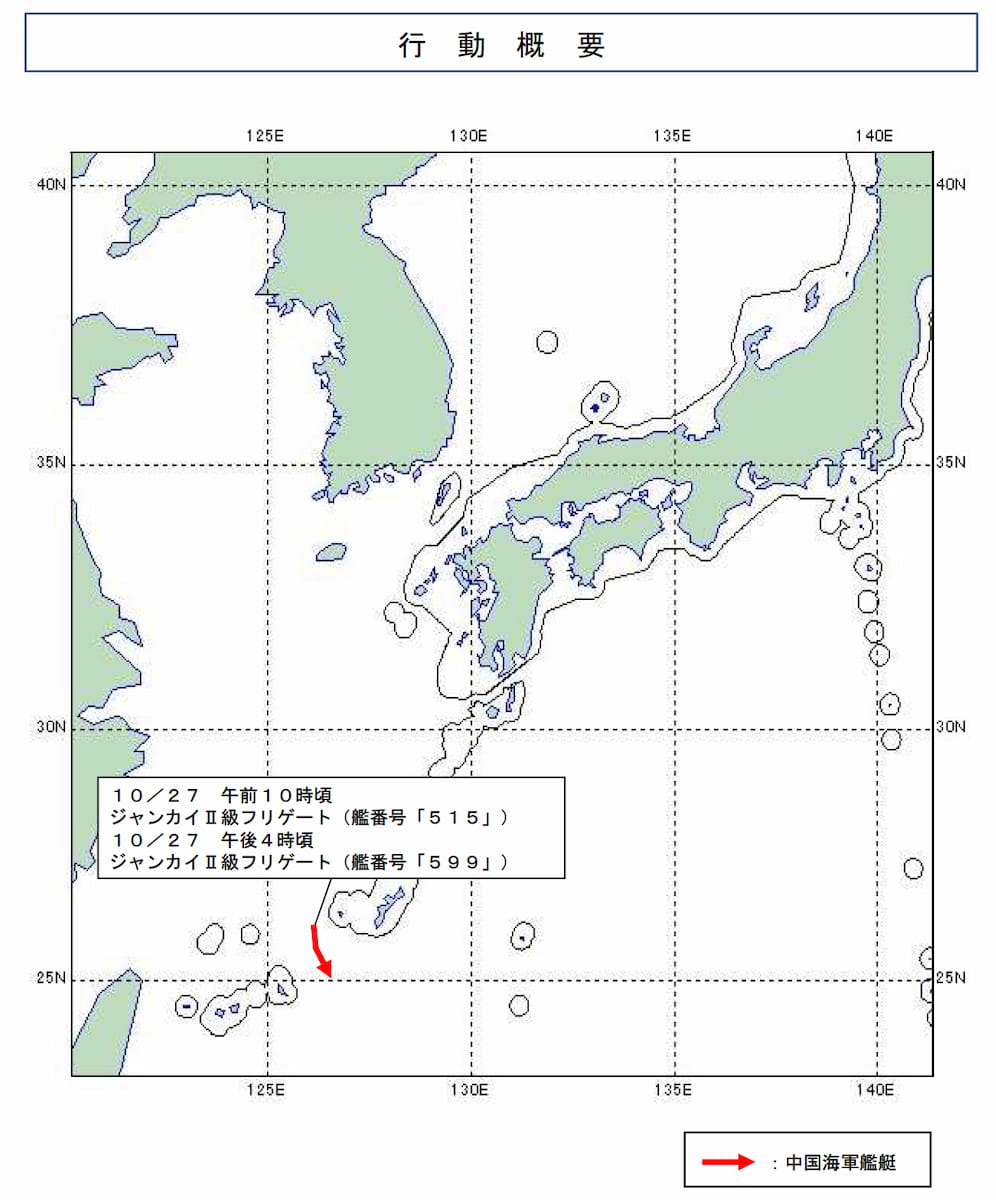 また、同日午後4時頃、海上自衛隊は、久米島の西約80kmの海域において、同海域を南進する中国海軍ジャンカイⅡ級フリゲート(艦番号「599」)を確認した。