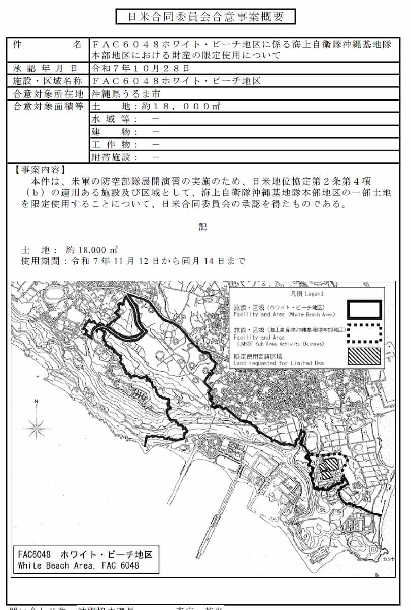 日米合同委員会において、FAC6048ホワイト・ビーチ地区に係る海上自衛隊沖縄基地隊本部地区における財産の限定使用について合意しましたのでお知らせします。