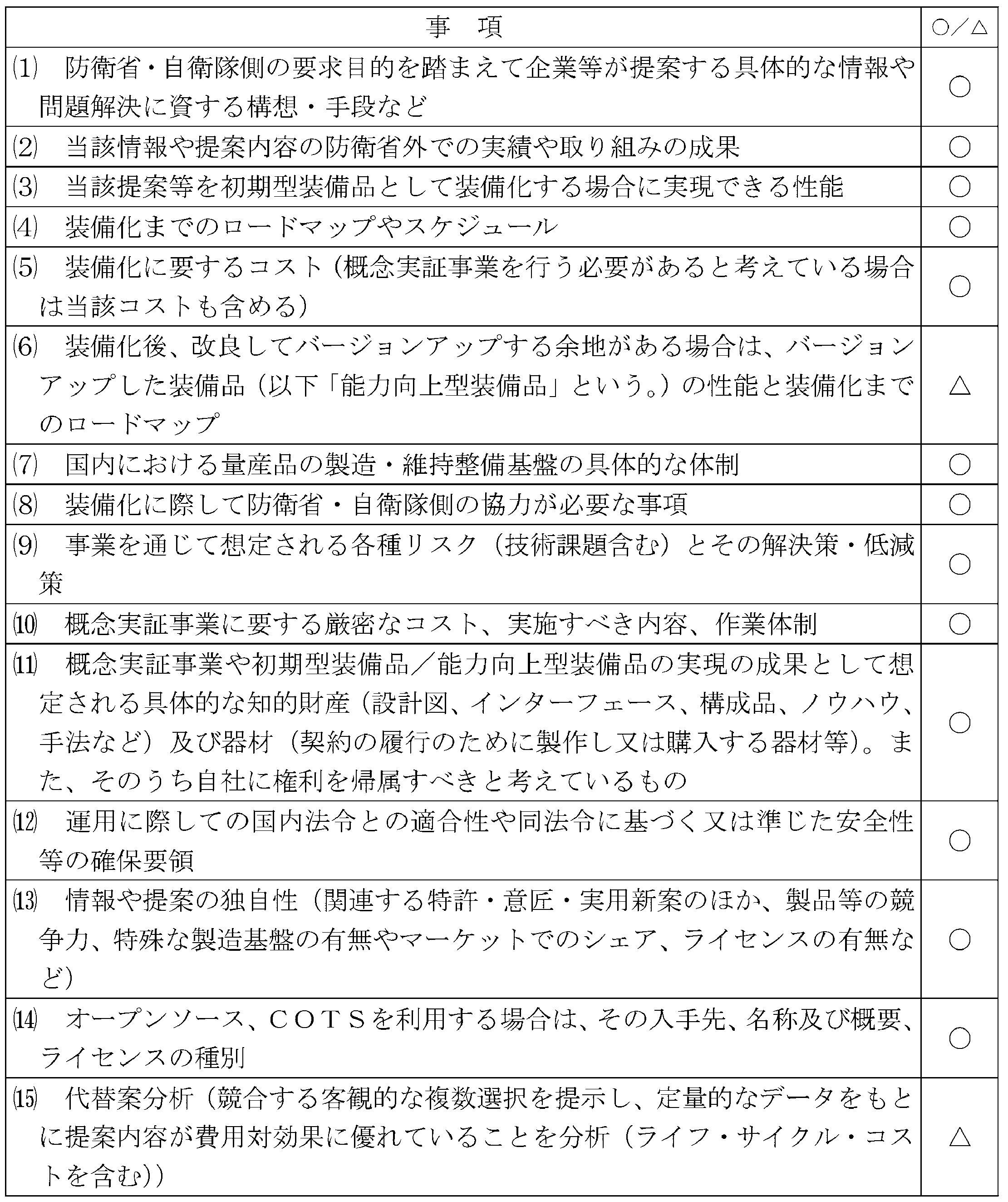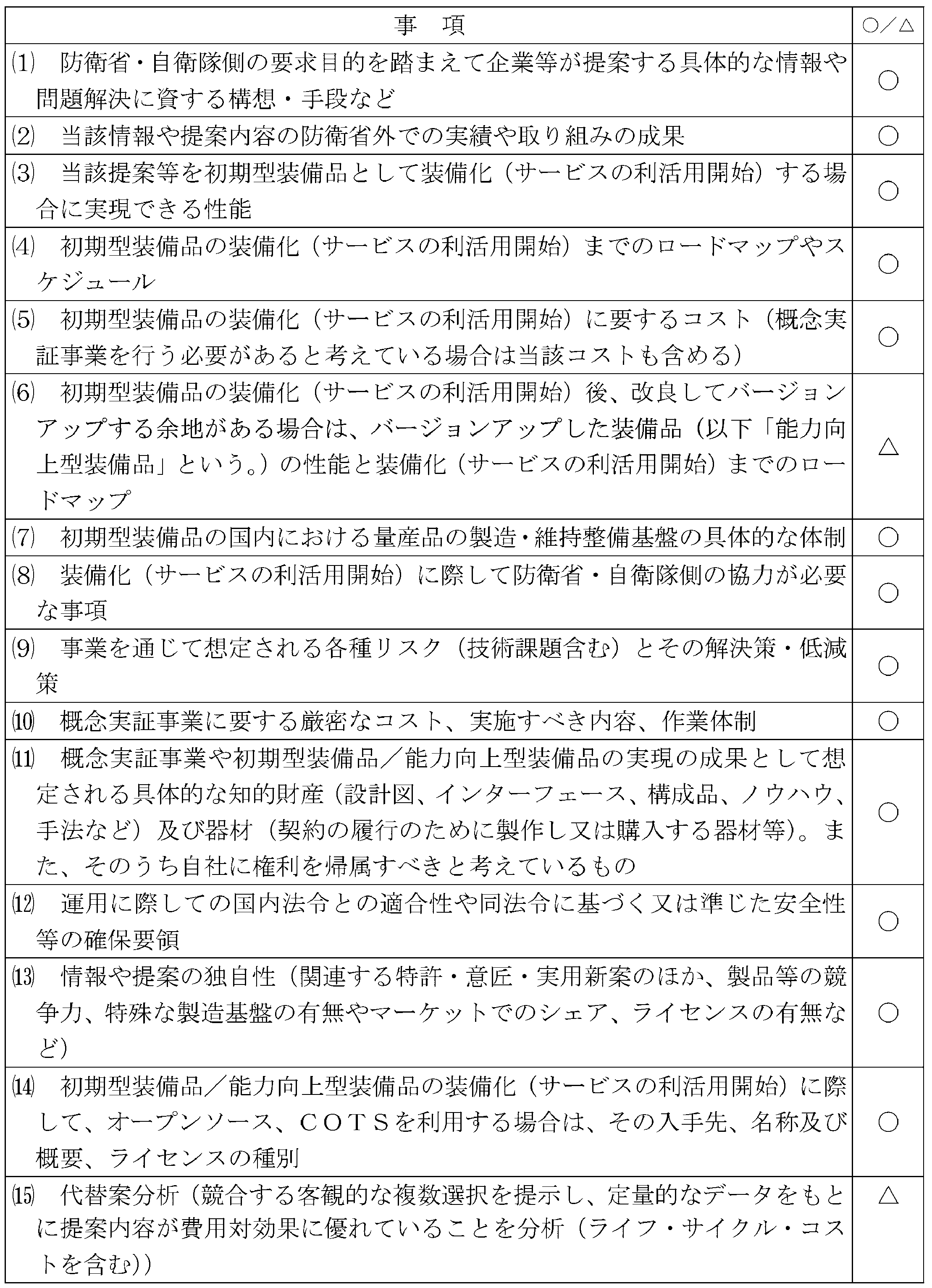 ※ 上記のいずれの項目の記載に際しては、早期装備化の視点に立脚すれば、留保をつけずに具体的かつ詳細な記述内容の方が望ましく、当該提案の速やかな事業成立の確度が高まることに留意