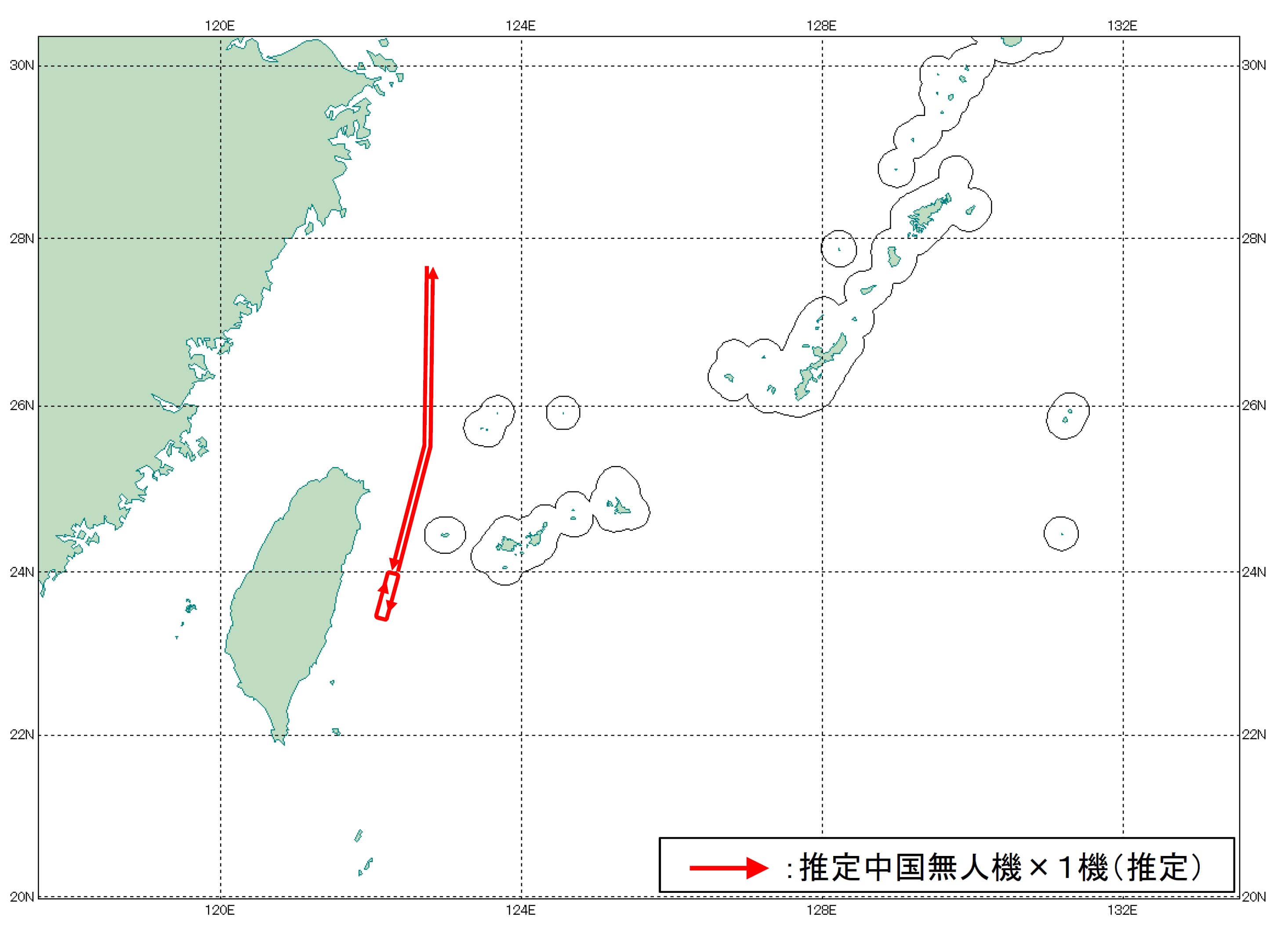 令和7年11月15日(土)午後、推定中国無人機1機(推定)が東シナ海から飛来し、与那国島と台湾との間を通過して太平洋に至り、太平洋上で旋回・反転し、再び与那国島と台湾との間を通過して東シナ海に至ったことを確認した。