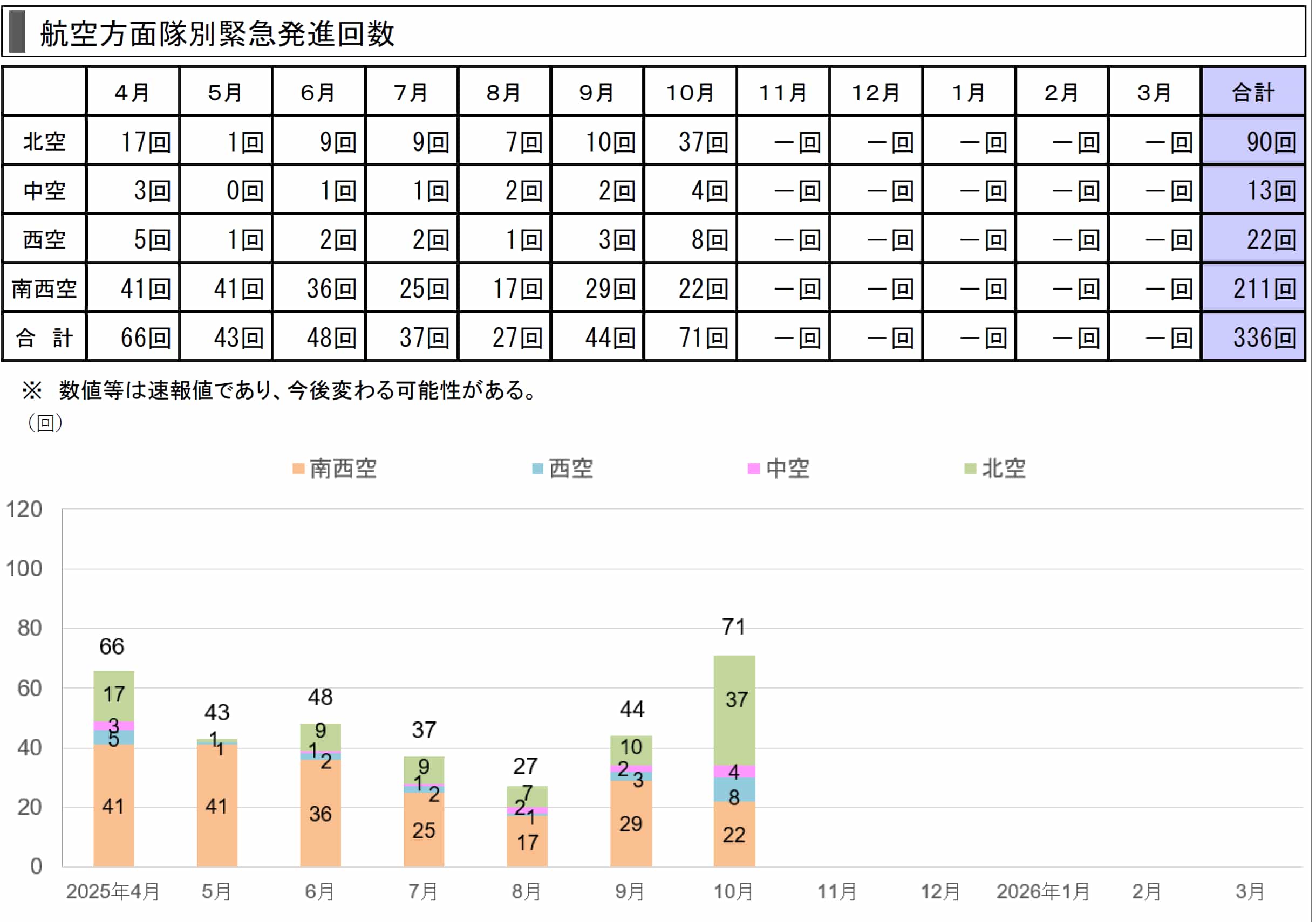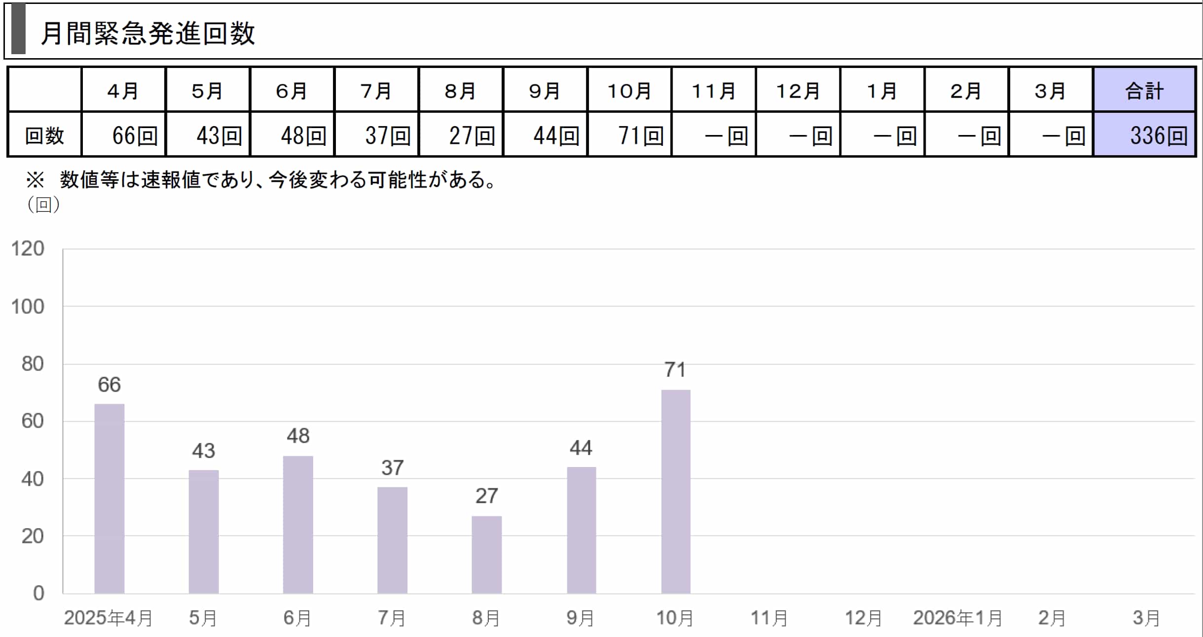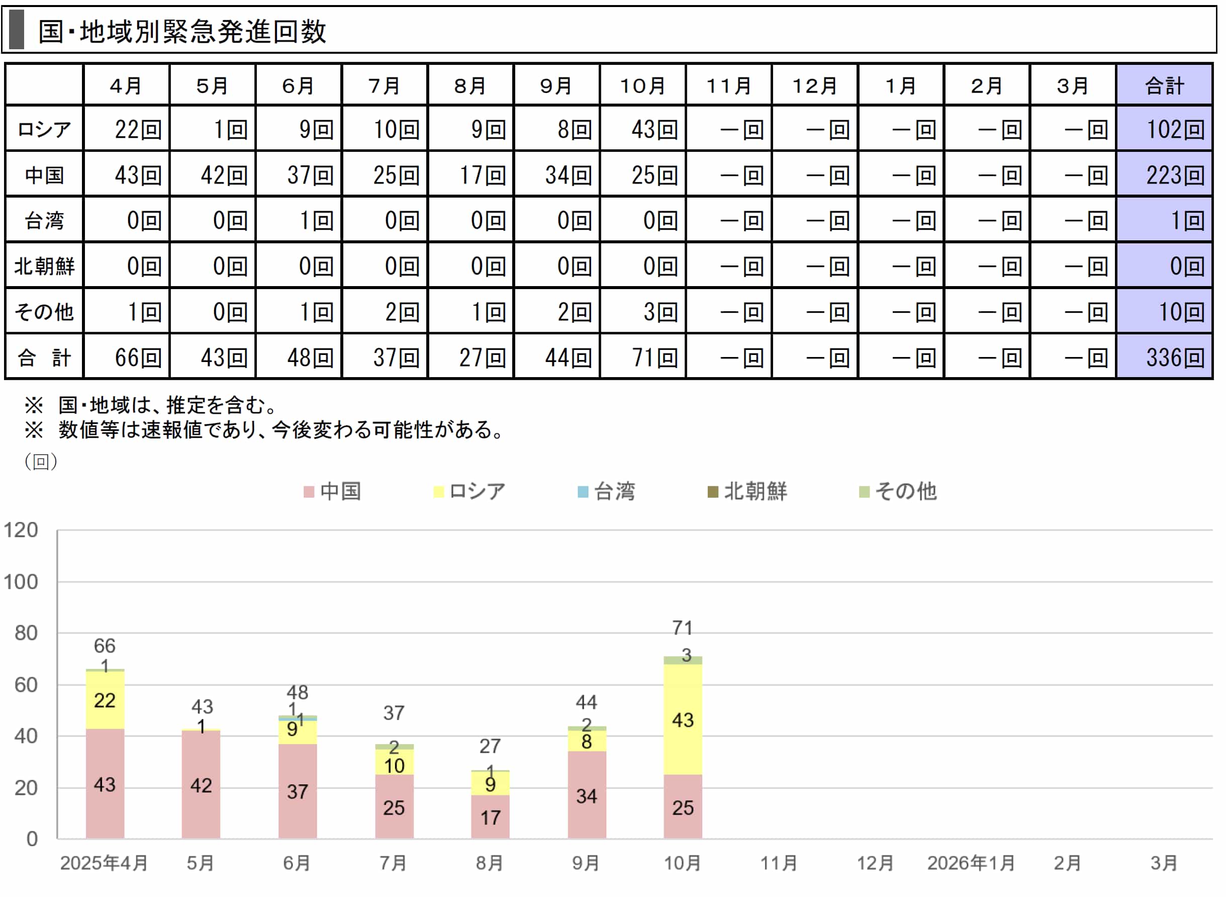 防衛省 統合幕僚監部は令和7(2025)年11月14日(金)、令和7(2025)年度における緊急発進実施状況として、同年10月31日現在の月間緊急発進状況を公表した。