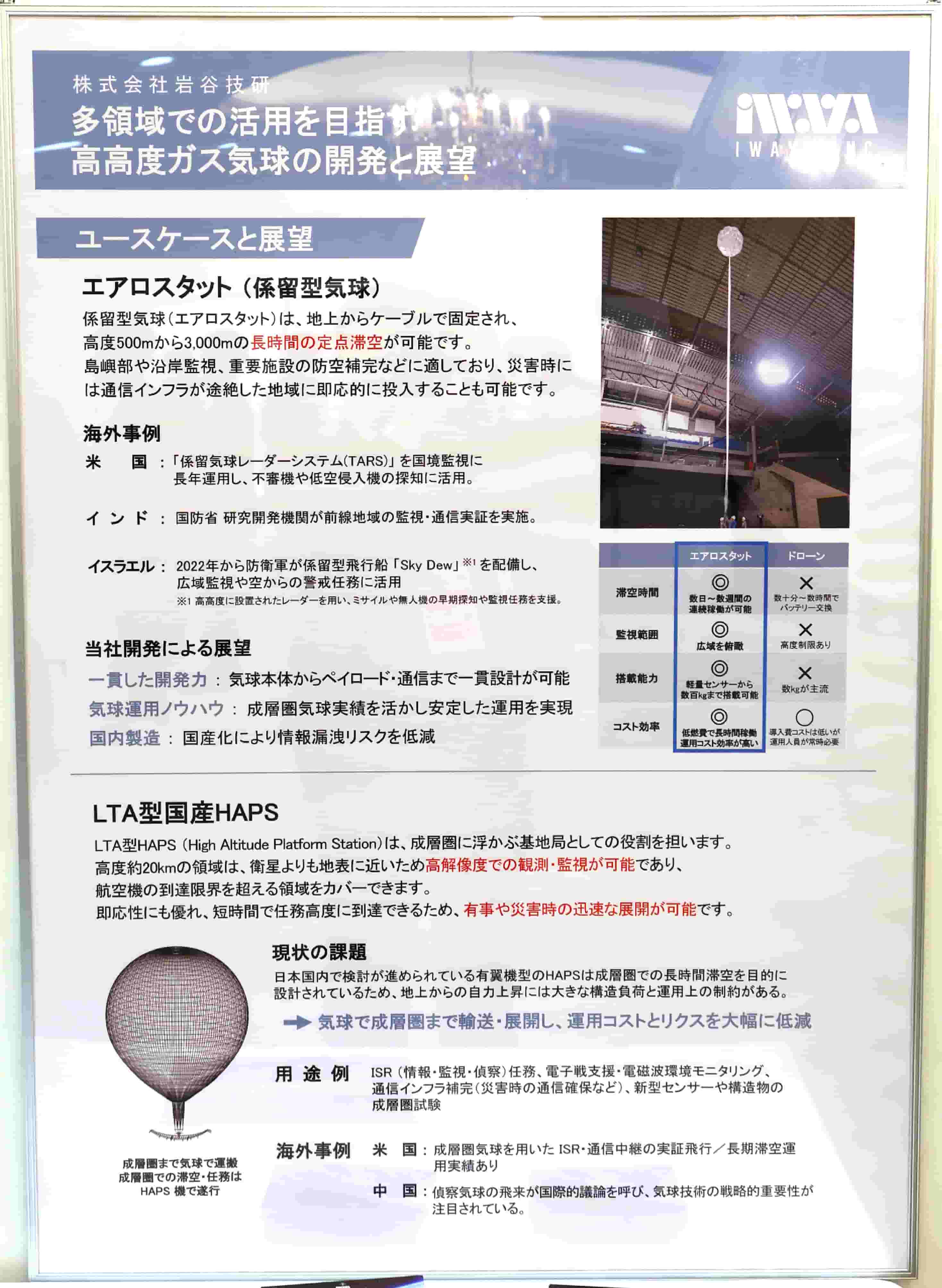 防衛装備庁の「技術シンポジウム2025」において、「多領域での活用を目指す高高度ガス気球の開発と展望」と題する展示が行われた。展示者は防衛装備庁ではなく、北海道を拠点とする民間企業の株式会社岩谷(いわや)技研だ。これまで防衛産業参入促進展やDSEI Japan 2025などでも出展していたが、この技術シンポジウムにも参加した。