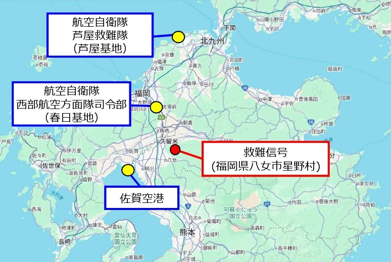 ・令和7年11月18日(火)10時13分頃、佐賀空港を離陸した小型セスナ機(搭乗員3名)が、福岡県八女市星野村上空にて救難信号を発し、東京RCC(東京救難調整本部)が受信。