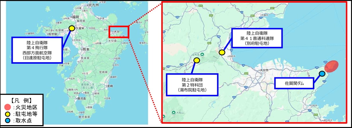 ○ 令和7年11月18日(火)、大分県大分市佐賀関において火災が発生。地元消防等による消火活動を実施するも鎮火に至らず、19日(水)09時00分、大分県知事から陸上自衛隊第4師団長(福岡・福岡県)に対し、消火活動及び情報収集に係る災害派遣要請があり、同時刻受理。
