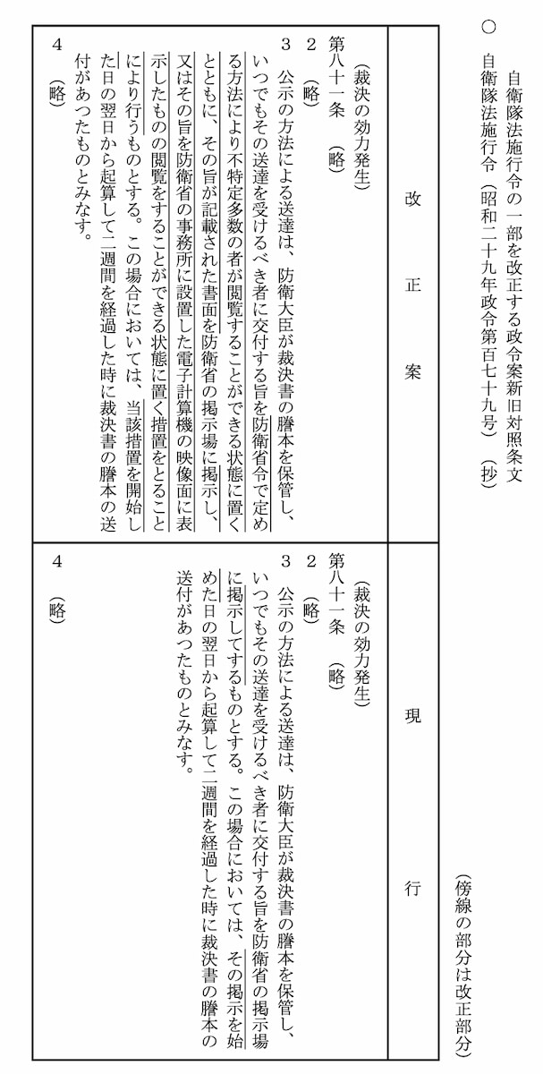 懲戒処分など裁決の公示の方法による送達の電子化について自衛隊法施行令の一部を改正(12月3日)