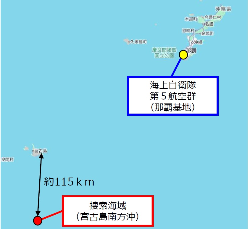 ・海上保安庁が捜索活動を継続するも発見に至らないことから、5日(金)22時13分、海上保安庁第11管区海上保安本部長から海上自衛隊第5航空群司令那覇・沖縄県)に対し、上空からの行方不明者捜索に係る災害派遣要請があり、同時刻受理。