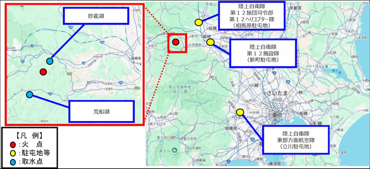 ○ 12月8日(月)、群馬県富岡市において林野火災が発生。地元消防等による消火活動を実施するも鎮火に至らないことから、同日18時30分、群馬県知事から陸上自衛隊第12旅団長相馬原・群馬県に対し、消火活動に係る災害派遣要請があり、同時刻受理。