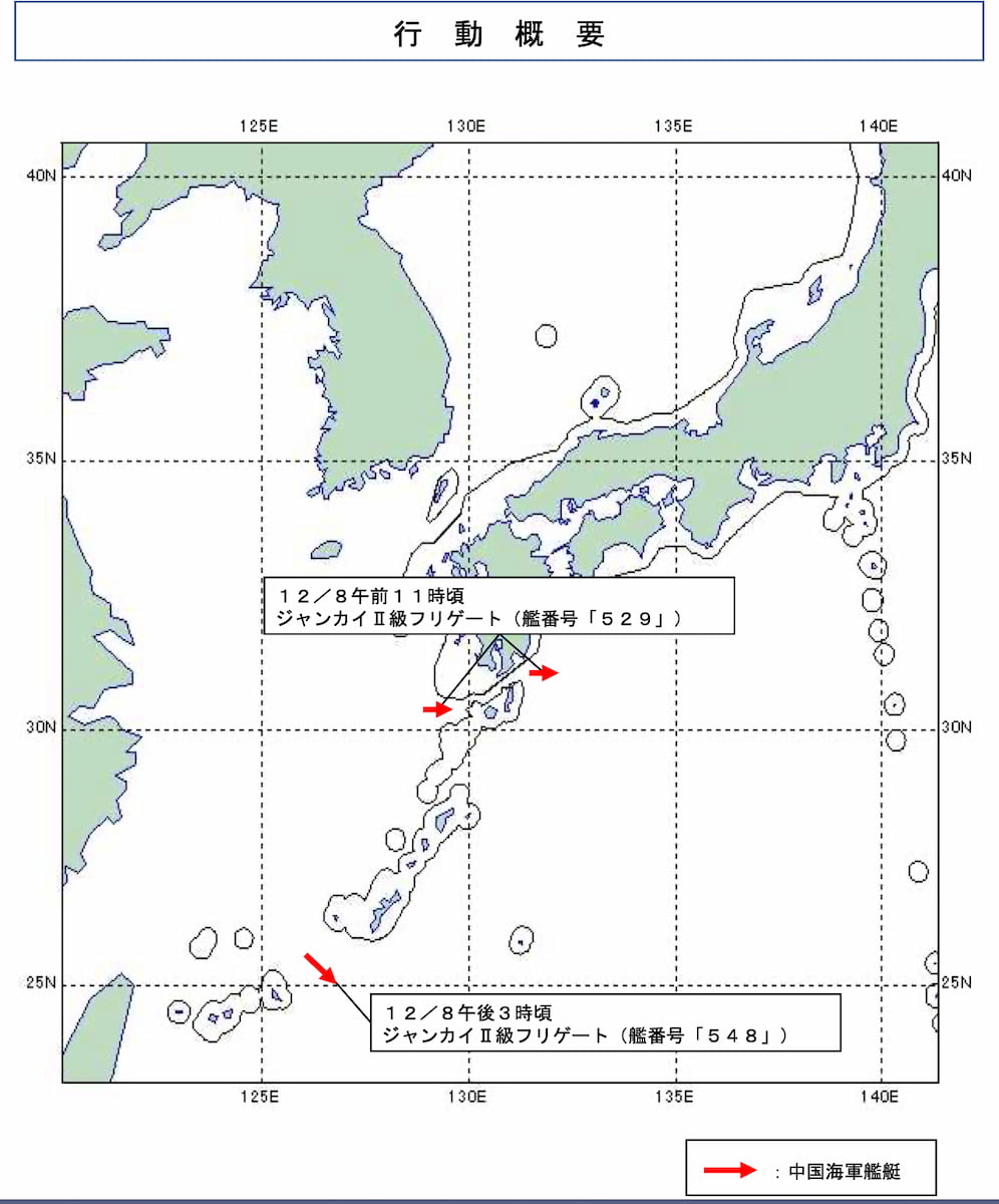 また、同日、午後3時頃、海上自衛隊は、宮古島(沖縄県)の北東約130kmの海域において、同海域を南東進する中国海軍ジャンカイⅡ級フリゲート(艦番号「548」)を確認した。