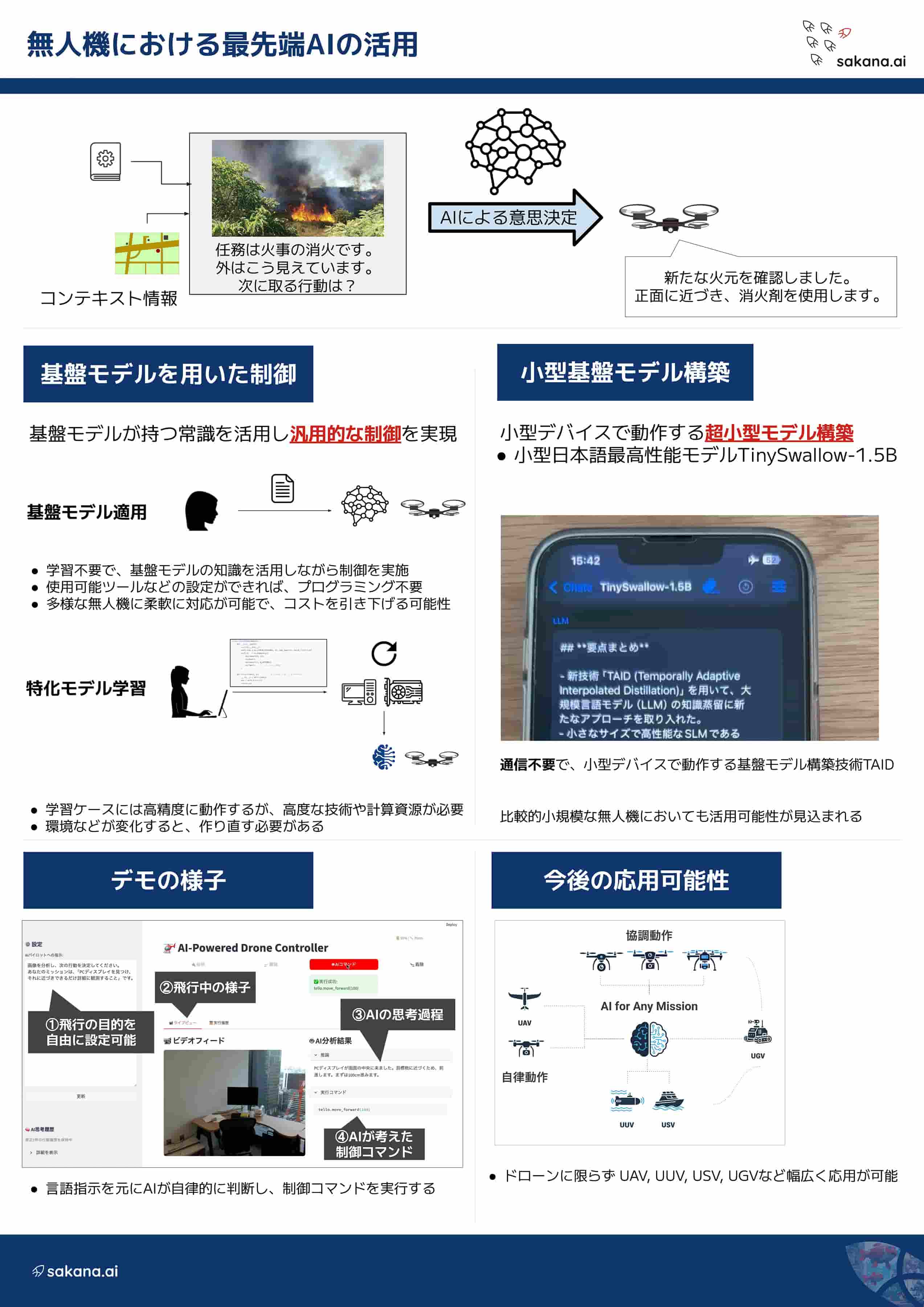 例えばドローンに小型AIを搭載すれば、一般的な日本語による命令をドローンが解釈し、インターネットに繋がらない/繋ぎたくない環境下においても、その場その場で判断して任務を遂行できるようになるという。
