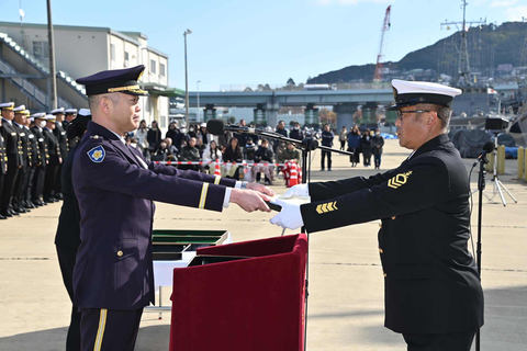 12月5日(金)、第51次派遣海賊対処行動水上部隊「はるさめ」が中東地域での任務を終え、母港である佐世保港に入港(帰国)し、宮崎防衛副大臣の臨席の下、帰国行事及び統合作戦司令部作戦部長による表彰状の伝達が行われました。