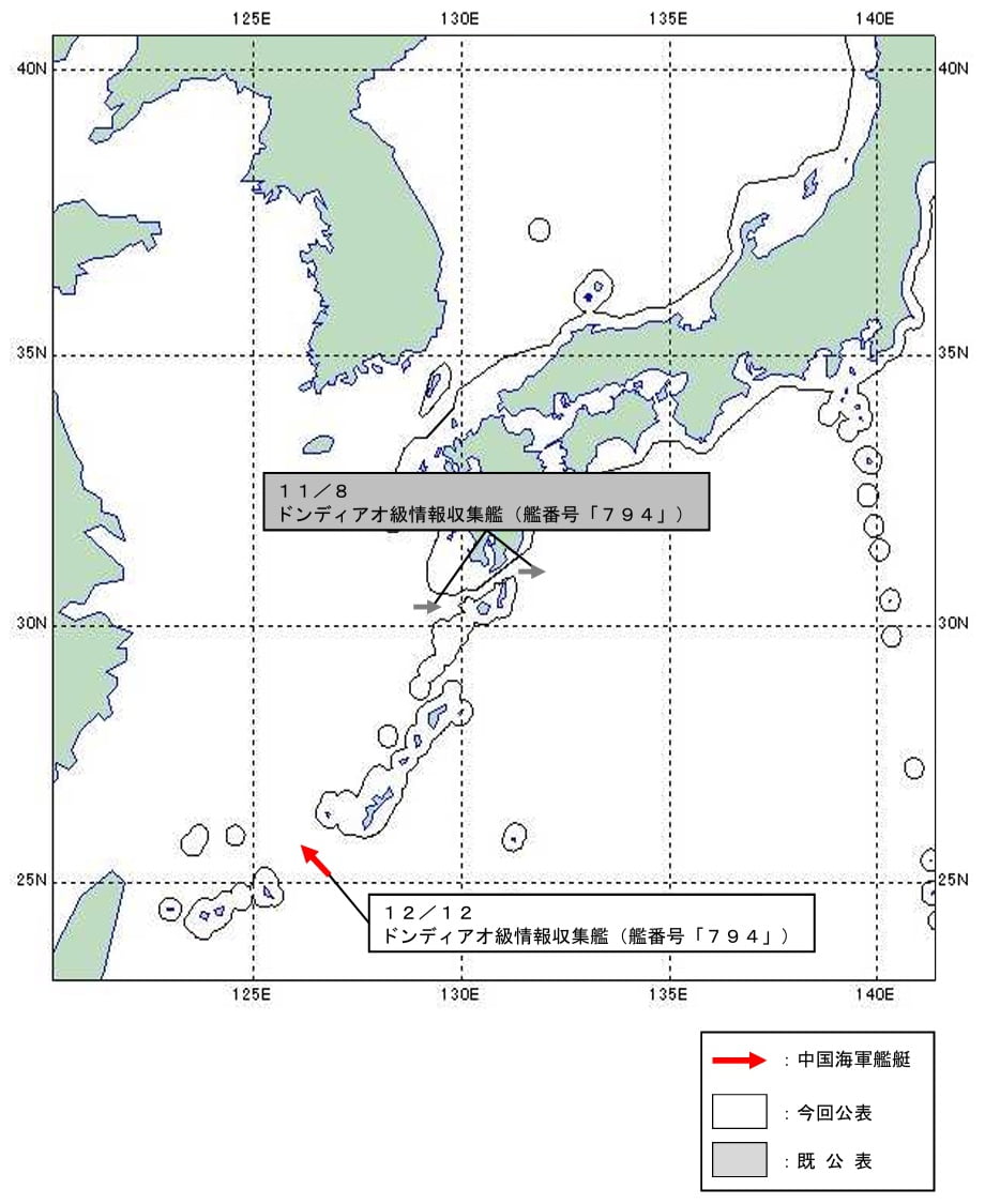 令和7年12月12日(金)午前7時頃、海上自衛隊は、宮古島(沖縄県)の北東約120kmの海域において、同海域を北西進する中国海軍ドンディアオ級情報収集艦(艦番号「794」)を確認した。