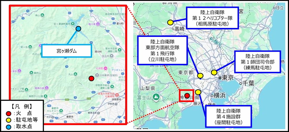 ○ 12日(金)16時50分に伊勢原市は鎮圧を宣言。同日17時00分に神奈川県知事から陸上自衛隊第1師団長に対し災害派遣撤収要請があり活動を終了。
