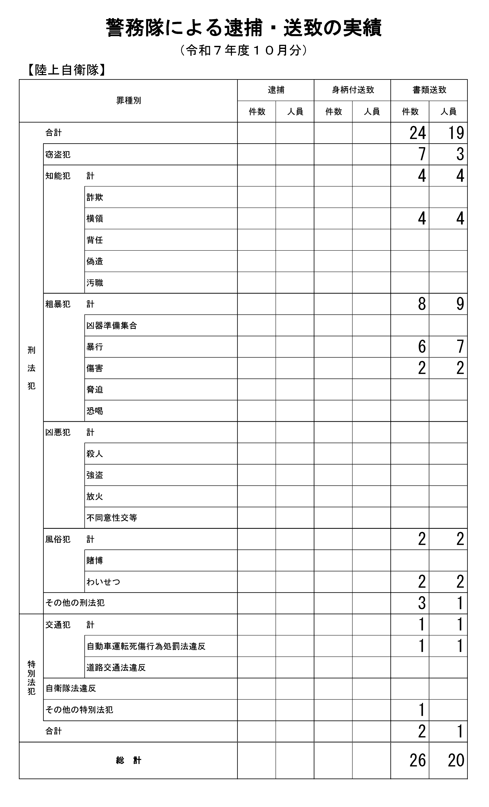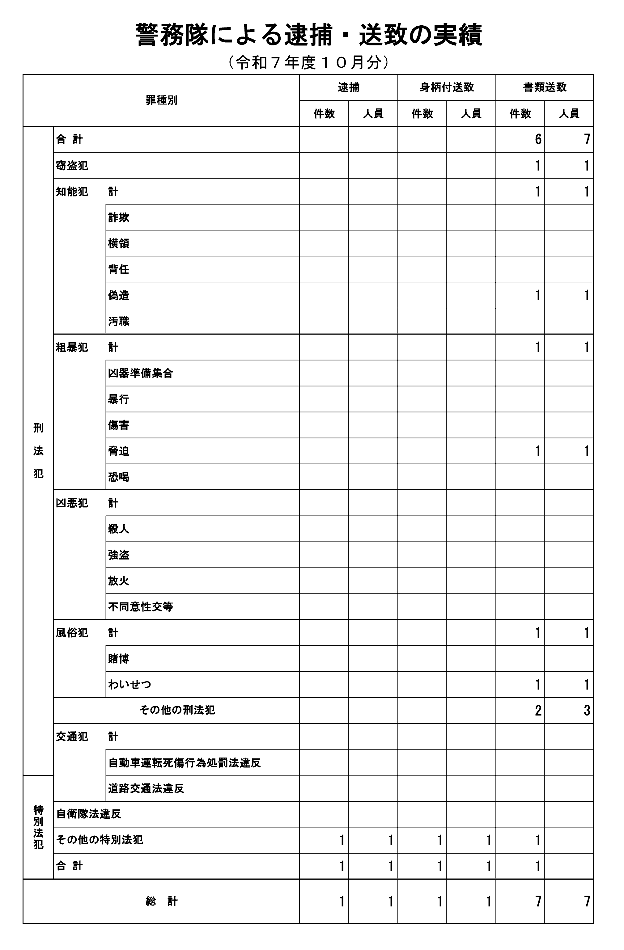 【陸上自衛隊】警務隊による逮捕・送致の実績(令和7年度10月分)
