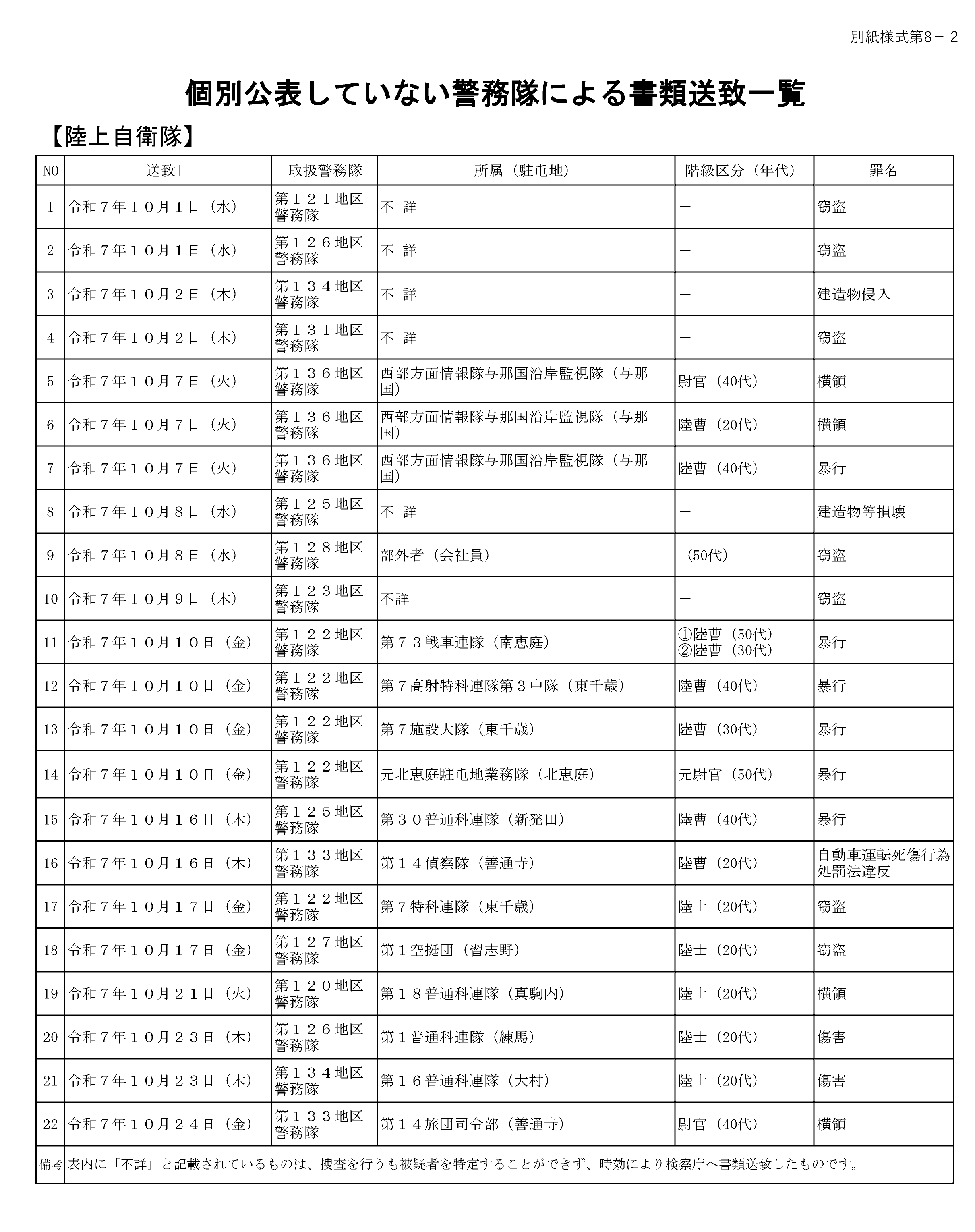 【陸上自衛隊】個別公表していない警務隊による書類送致一覧