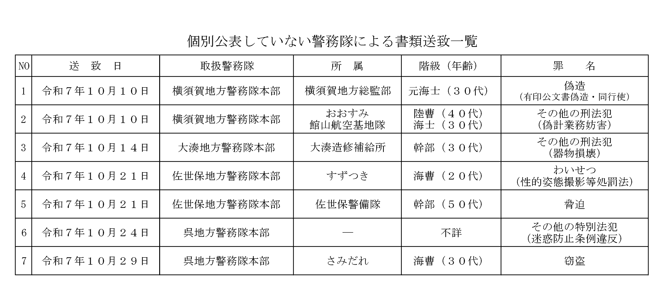 【海上自衛隊】個別公表していない警務隊による書類送致一覧