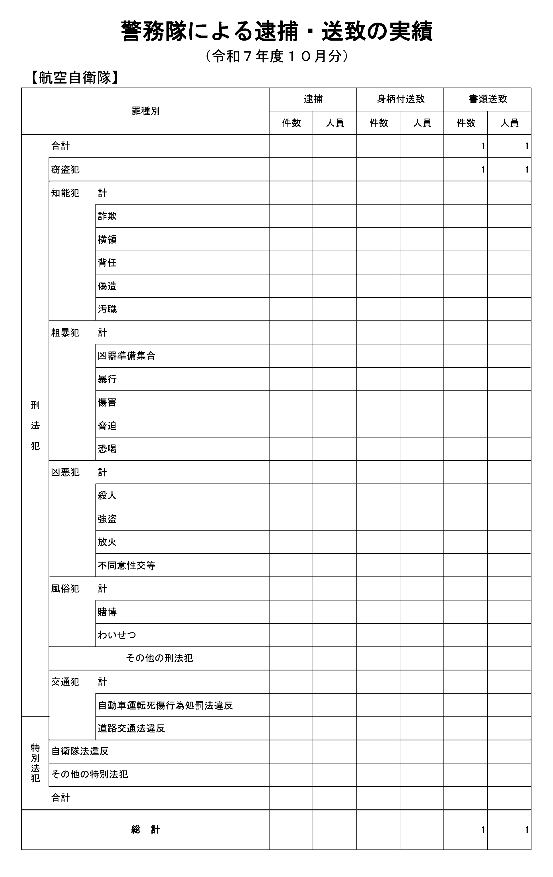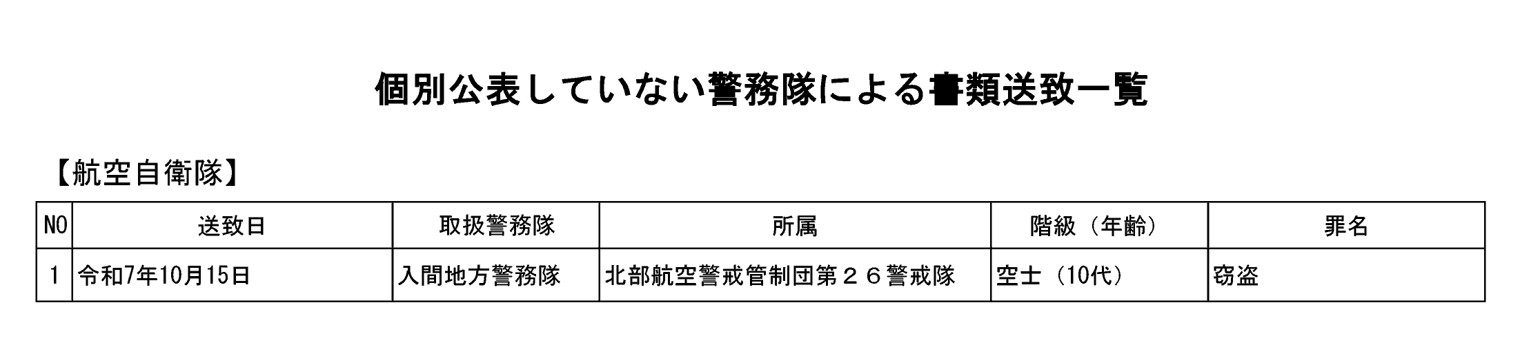 【航空自衛隊】警務隊による逮捕・送致の実績(令和7年度10月分)