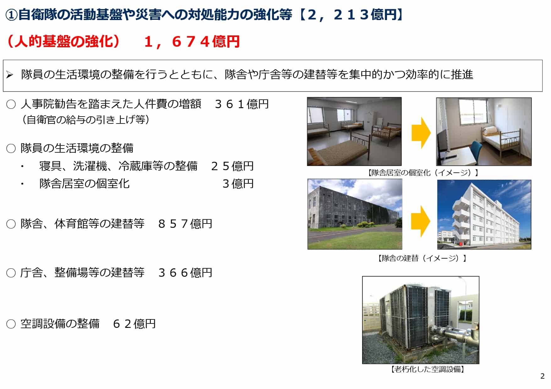 ・隊員の生活環境の整備を行い、隊舎や庁舎等の建替等を推進(1,674億円)