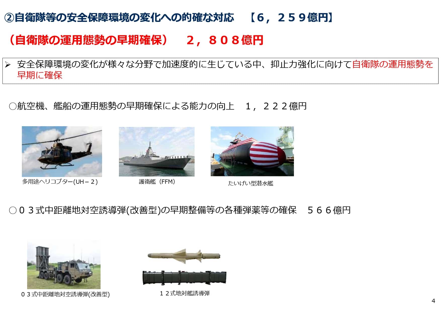 多用途ヘリUH-2、護衛艦FFM、たいげい型潜水艦、03式中距離地対空誘導弾(改善型)等