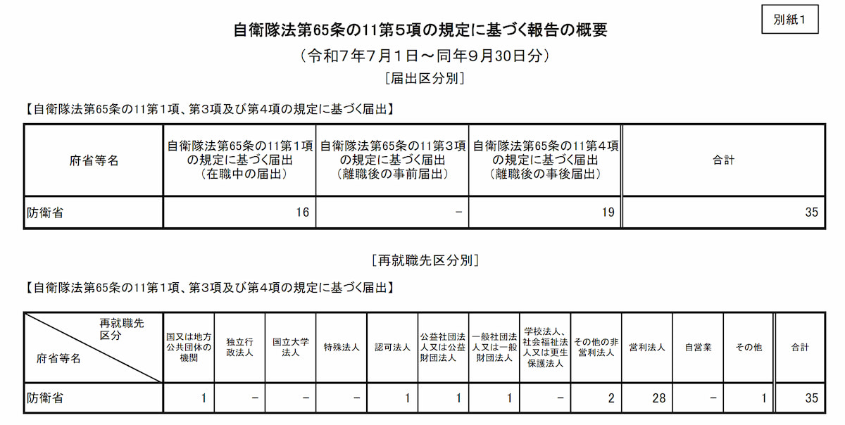 防衛省は令和7(2025)年12月19日(金)10時35分、自衛隊法第65条の11第5項の規定に基づく自衛隊員の再就職状況の公表について、閣議資料を報道に公開した。