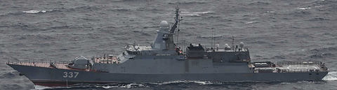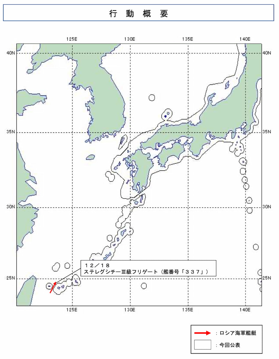 令和7年12月18日(木)午後3時頃、海上自衛隊は、与那国島(沖縄県)の南約120kmの海域において、同海域を北東進するロシア海軍ステレグシチーⅢ級フリゲート(艦番号「337」)を確認した。