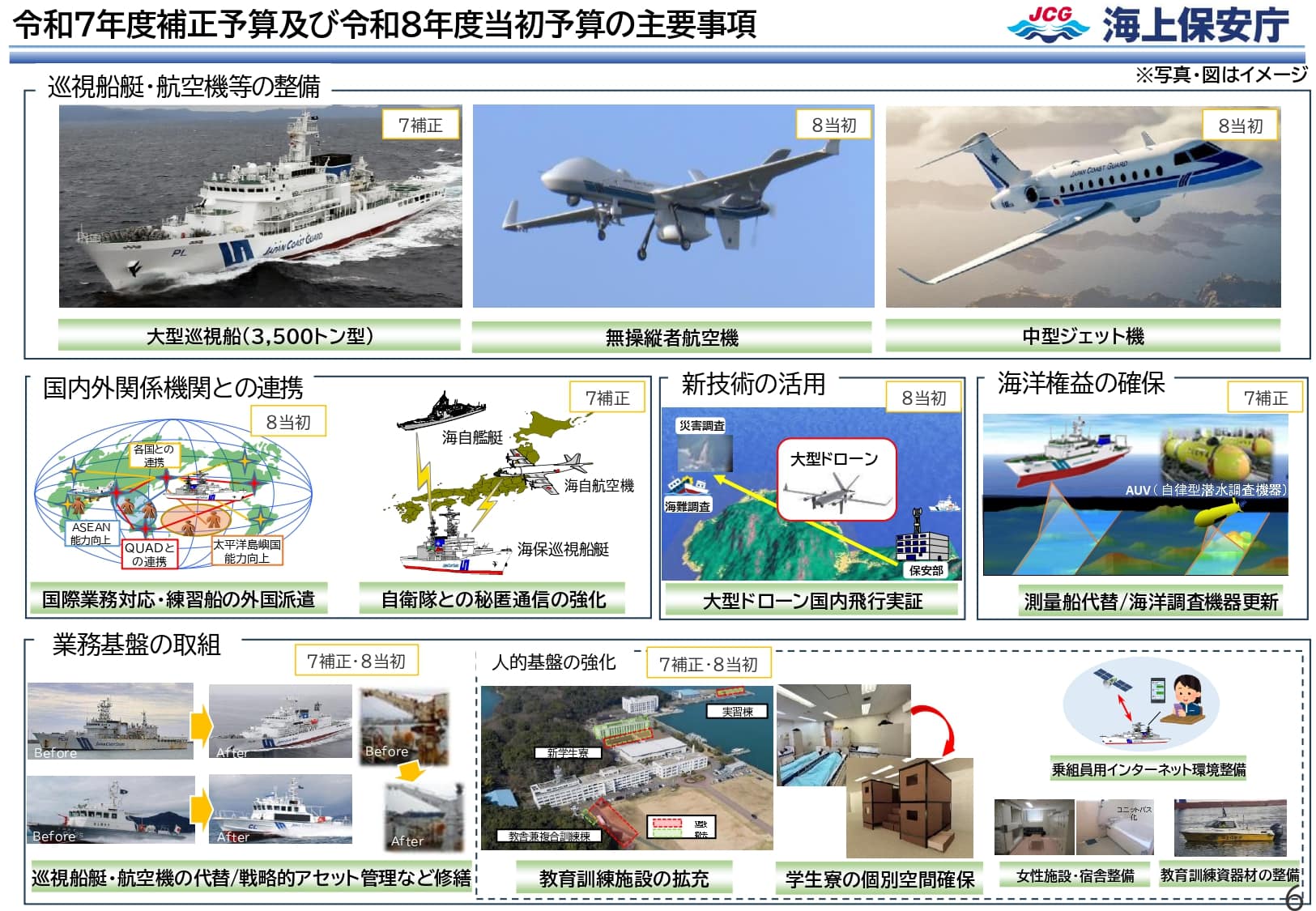 「我が国周辺海域を巡る情勢については一層厳しさを増している状況ですが、我が国の領土・領海を断固として守り抜かなければなりません。令和8年度におきましても大型巡視船の増強等を進めるほか、防衛省・自衛隊等との更なる連携強化を進めるとともに、日米、日米韓、日米比、日米豪印等の多角的な連携を通じて、「自由で開かれたインド太平洋」を引き続き力強く推進します。
