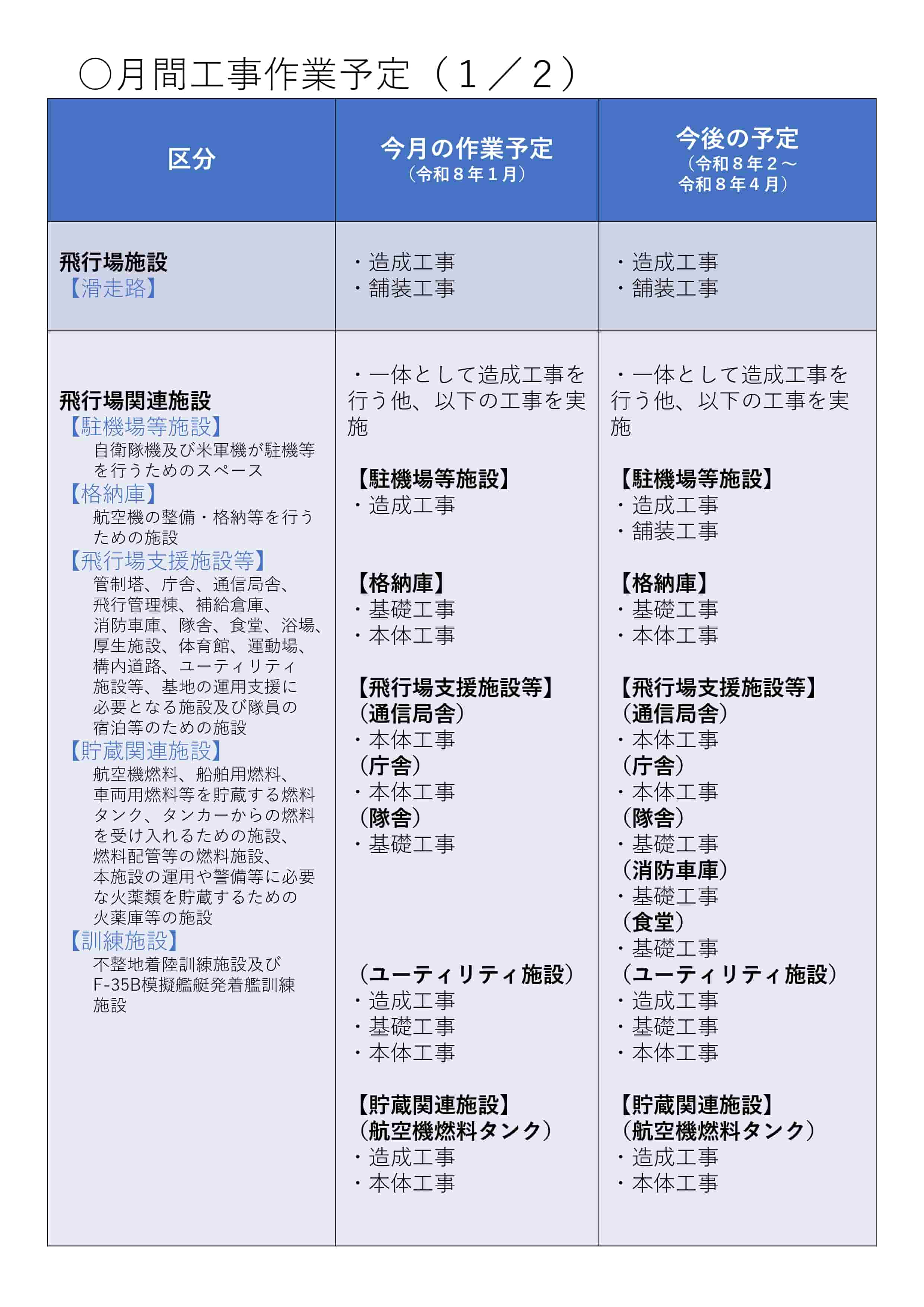 防衛省 九州防衛局は令和8(2026)年1月5日(月)、ウェブサイトにおいて、令和8年1月および令和8年2月~4月に実施するに実施する自衛隊基地の工事作業と環境保全措置等の予定を公表した。あわせて施設整備状況の写真を公開した。
