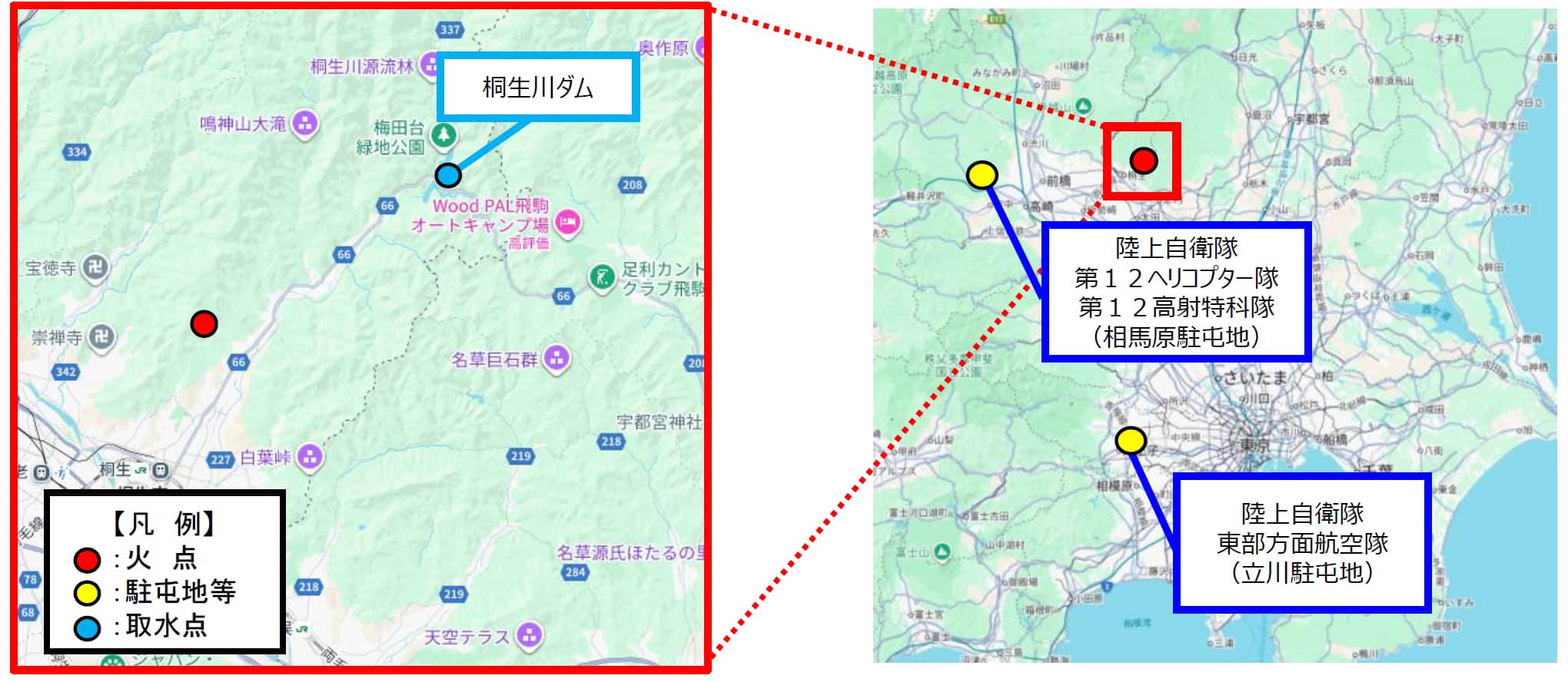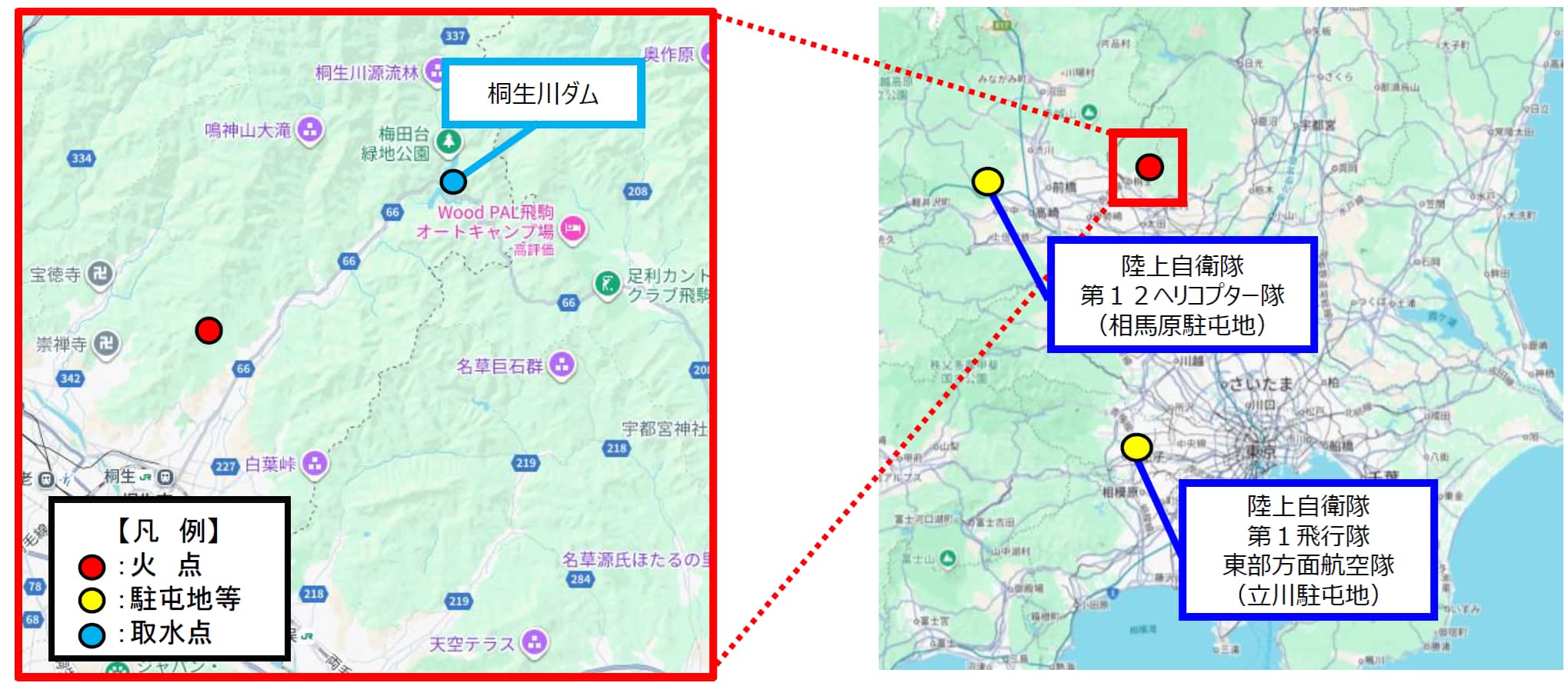 ・同日16時以降、陸上自衛隊第12ヘリコプター隊(相馬原・群馬県)、陸上自衛隊東部方面航空隊(立川・東京都)が、空中消火活動等を実施。