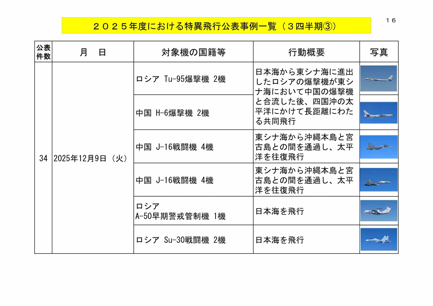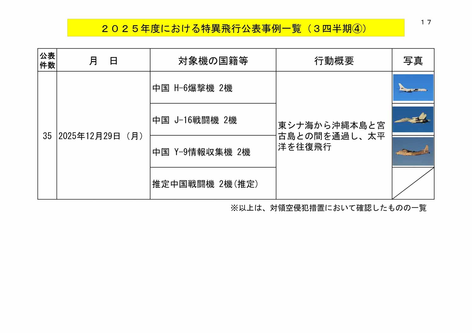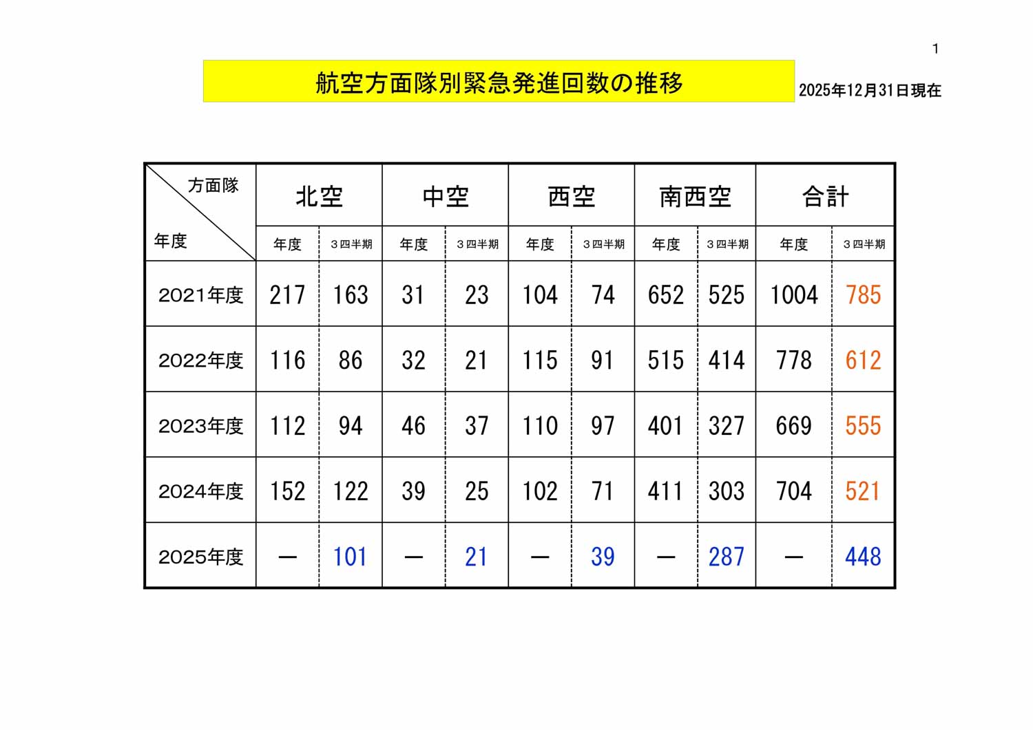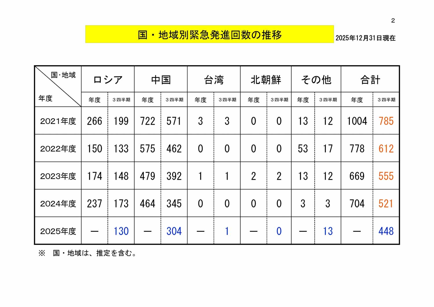 防衛省 統合幕僚監部は令和8(2026)年1月16日(金)13時00分、2025年度(令和7年度)3四半期までの緊急発進実施状況について以下のように公表した。