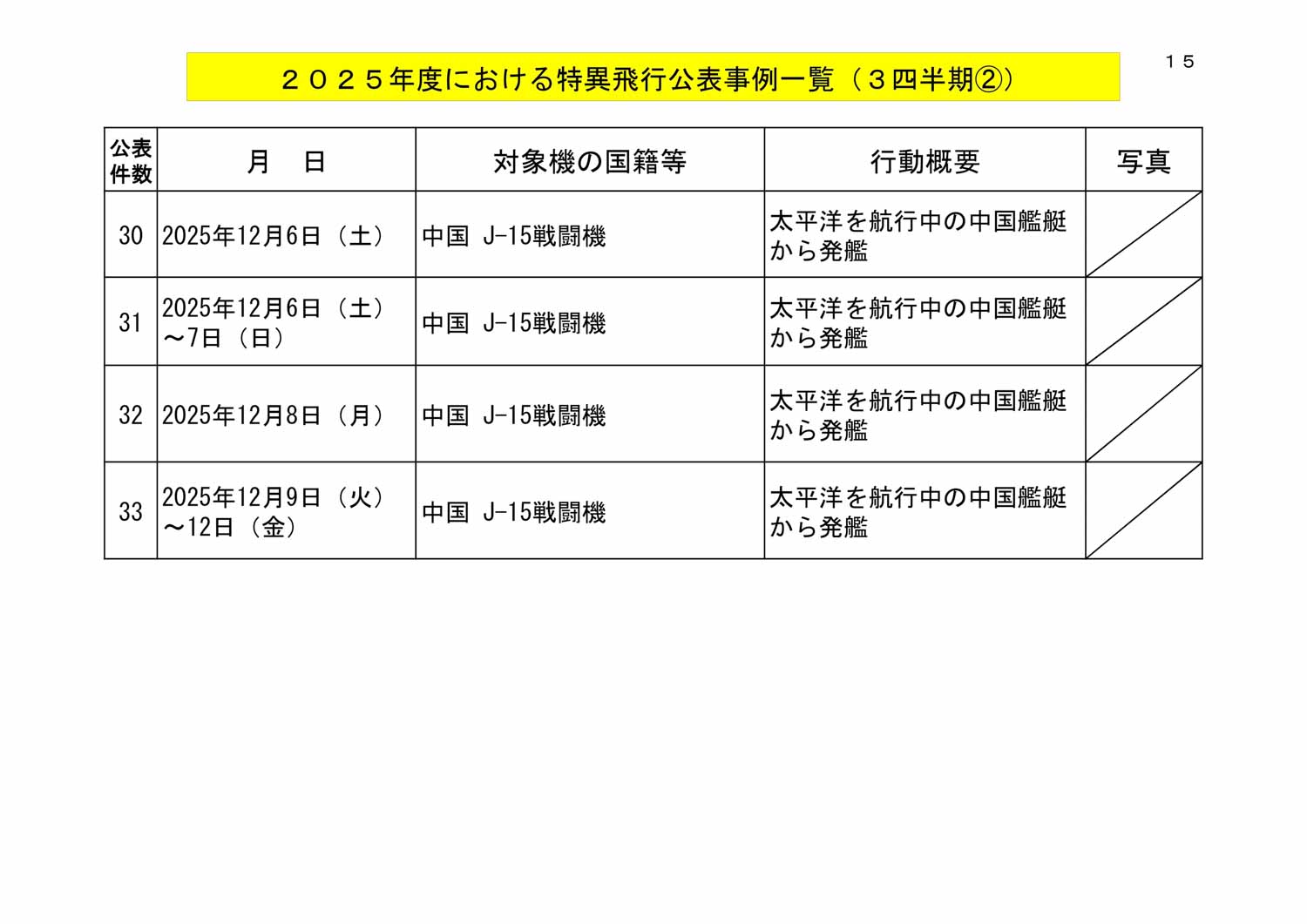 また、12月6日には、中国空母から発艦したJ-15戦闘機が、当該機体に対する対領空侵犯措置を実施していた航空自衛隊のF-15戦闘機に対して、レーダー照射を断続的に行う事案が発生しました。