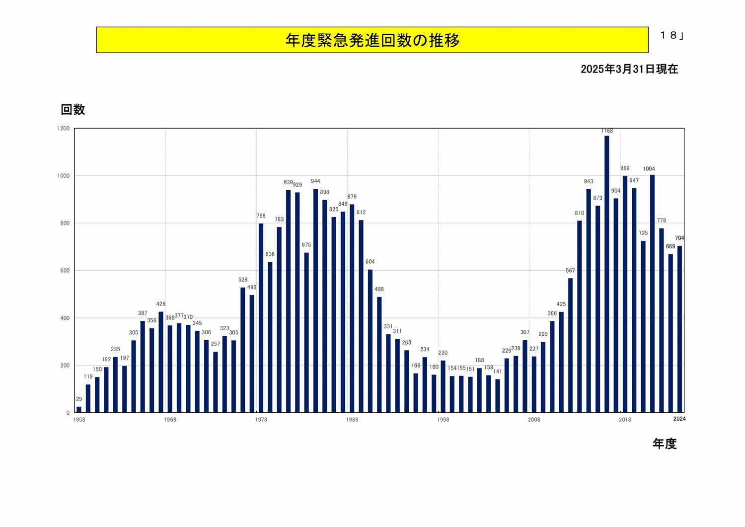 2025年度3四半期(2025年4月1日~2025年12月31日)における緊急発進回数は448回でした。(2024年度3四半期(2024年4月1日~2024年12月31日)の緊急発進回数は521回。)