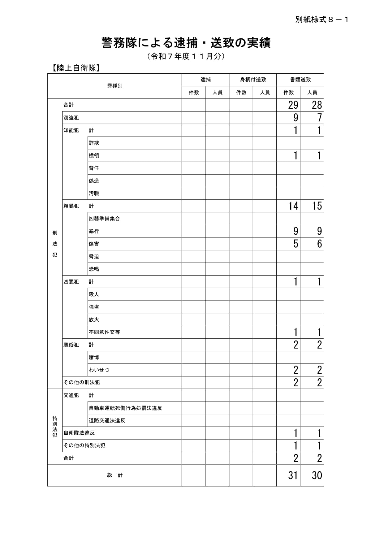 防衛省 陸上幕僚監部は令和8(2026)年1月16日(金)16時30分、令和7(2025)年11月の警務隊による逮捕・送致の実績について以下のように公表した。